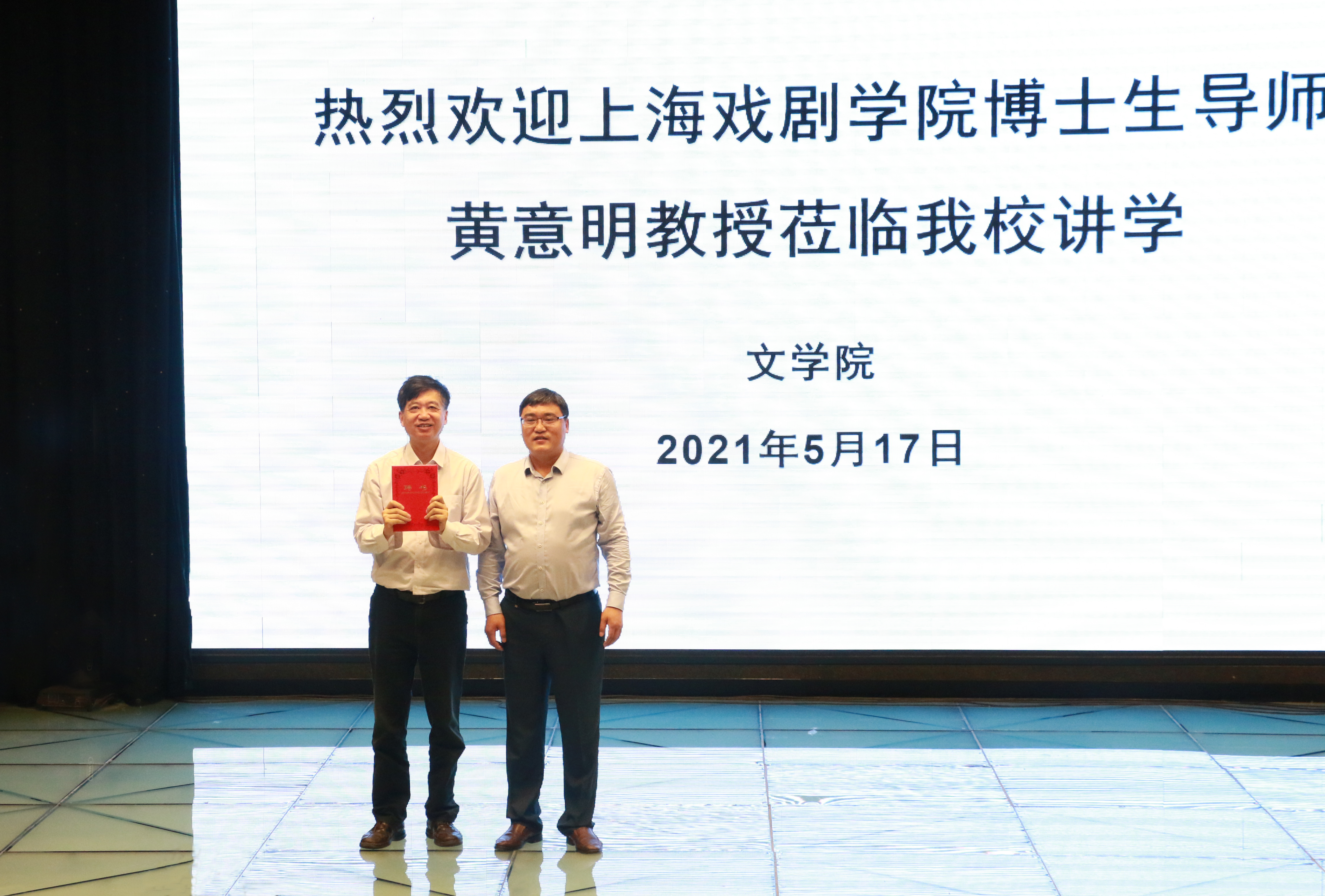 5月17日上午,应文学院邀请,上海戏剧学院博士生导师黄意明教授在图书馆演播厅做了一场题为《中国古代诗歌的文化精神和现代解读》的讲座。人事处处长马亚军、文学院院长孙振杰、文学院副院长王惠,以及全校100余名师生参加了讲座。马亚军代表学校向黄意明教授颁发了平顶山学院客座教授聘书。讲座及聘任仪式由孙振杰主持。
