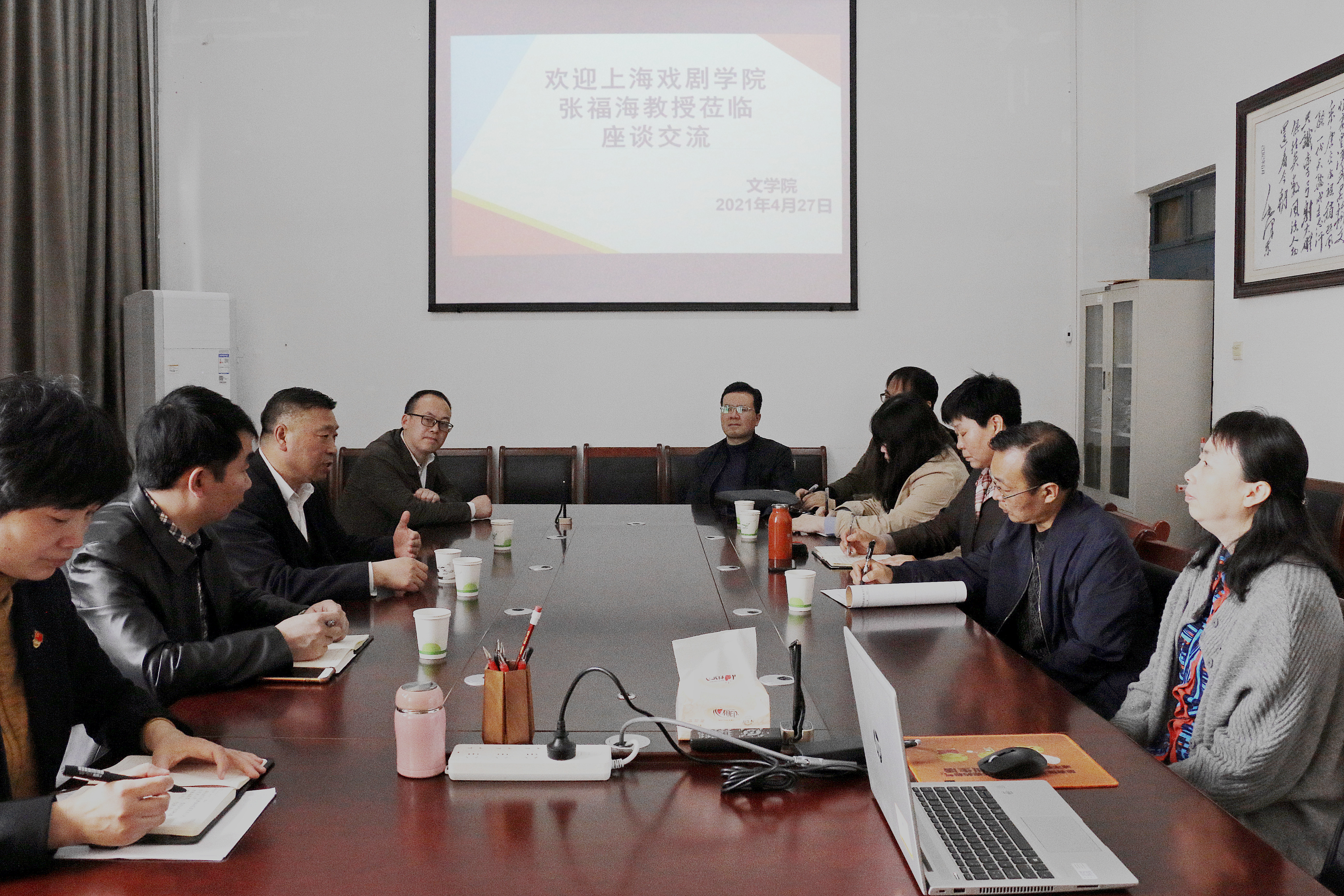 4月27日10:00,张福海教授与文学院写作与文学理论教研室、戏剧影视文学教研室部分教师举行座谈。在座谈中,张福海与在场教师就专业建设、课程设置以及学术研究等问题进行了热烈交流,对文学院坚持以创作为实践教学方向的做法提出了中肯的建议。