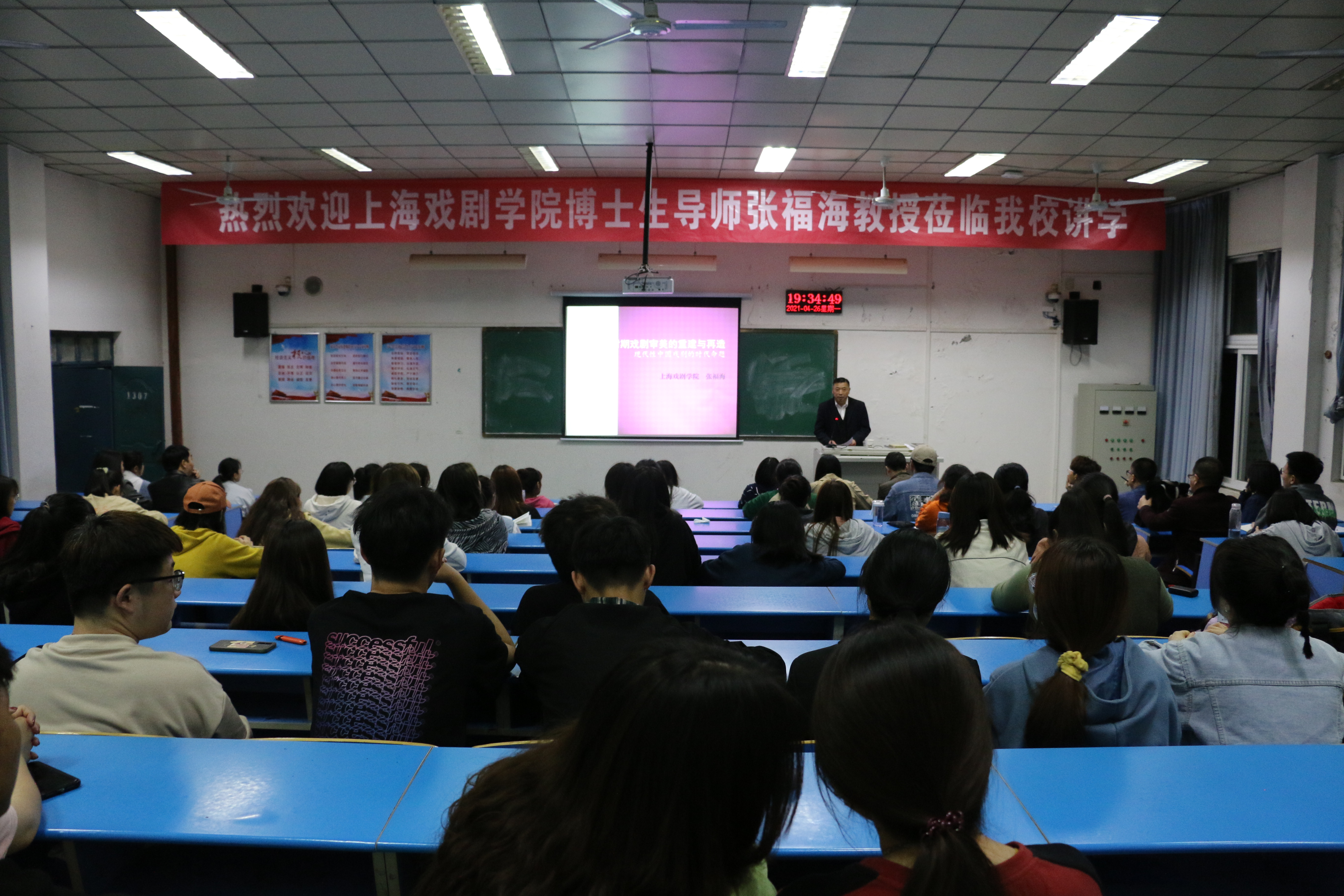 4月26日19:00,应文学院邀请,上海戏剧学院博士生导师、国家社科基金艺术学重大项目首席专家张福海教授在1307教室做了一场题为《变革时期的戏剧审美重建与再造——中国戏剧现代性的时代命题》的学术讲座。讲座由文学院院长孙振杰主持,文学院党委书记申自强及2019级、2020级戏剧影视文学专业部分师生100余人参加了活动。