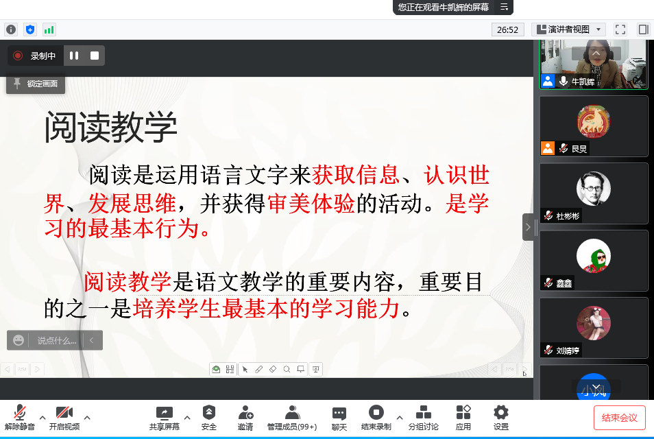 4月7日下午,河南省优秀教师、宝丰县教体局教研室副主任牛凯辉应邀作题为《阅读教学的反思与实践》线上报告,文学院相关负责人,2018级汉语言文学、汉语国际教育专业学生,其他师范专业学生200余人参加了报告会。报告会由文学院教学科研办公室主任杜彬彬主持。