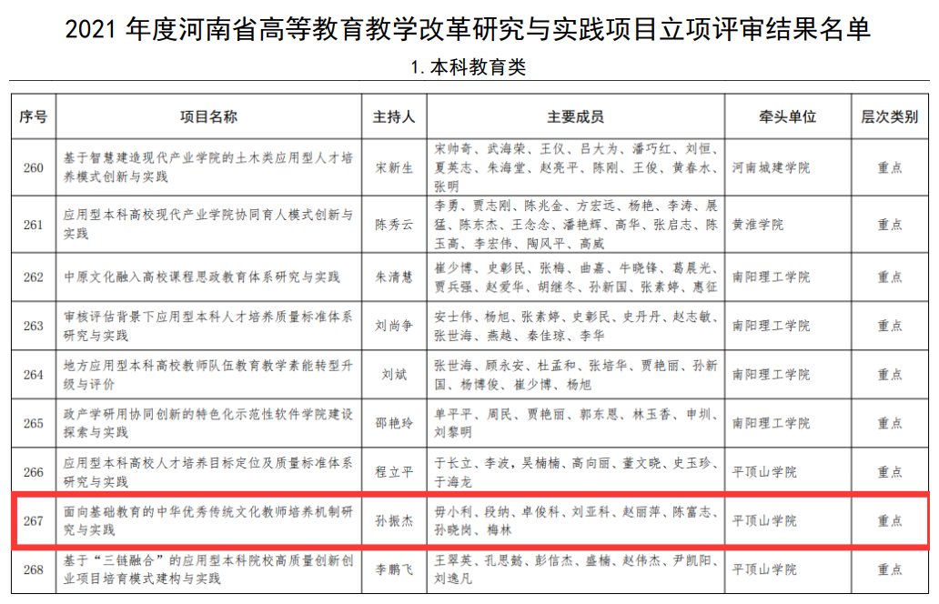 近日,河南省教育厅发布《关于2021年度河南省高等教育教学改革研究与实践项目立项评审结果的通知》(教高〔2022〕138号),文学院孙振杰博士主持的《面向基础教育的中华优秀传统文化教师培养机制研究与实践》获批2021年度河南省高等教育教学改革研究重点项目立项。