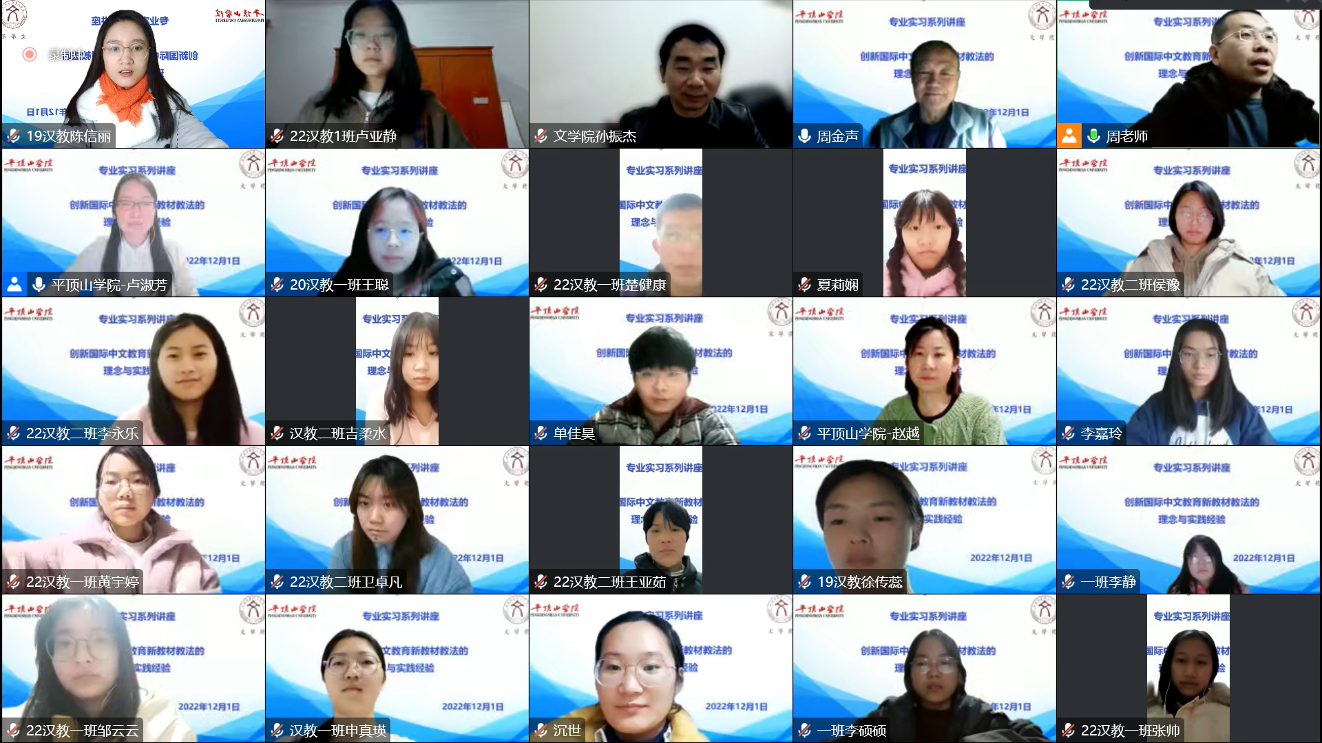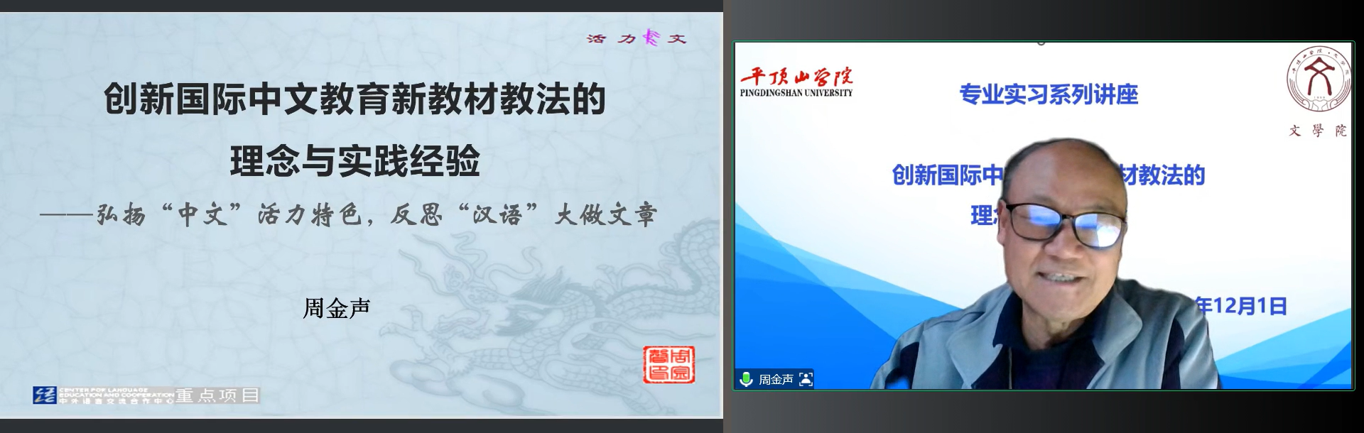12月1日晚,文学院专业实习系列讲座第四场在腾讯会议举行,喀什大学特聘教授周金声作了题为《创新国际中文教育新教材教法的理念与实践经验》的报告,文学院语言教研室全体教师,汉语国际教育专业四个年级200余名学生线上参加了报告会。报告会由语言教研室主任卢淑芳主持。