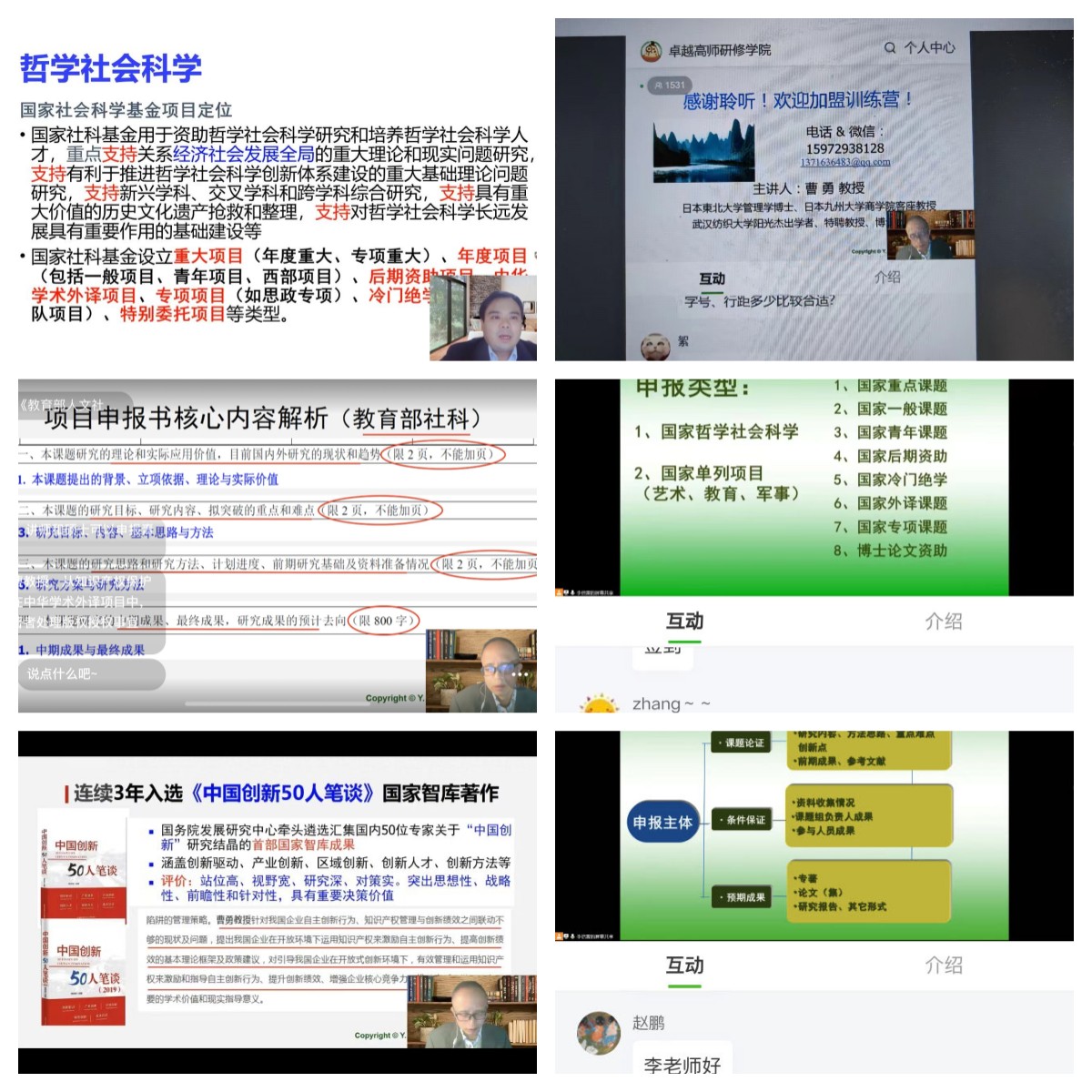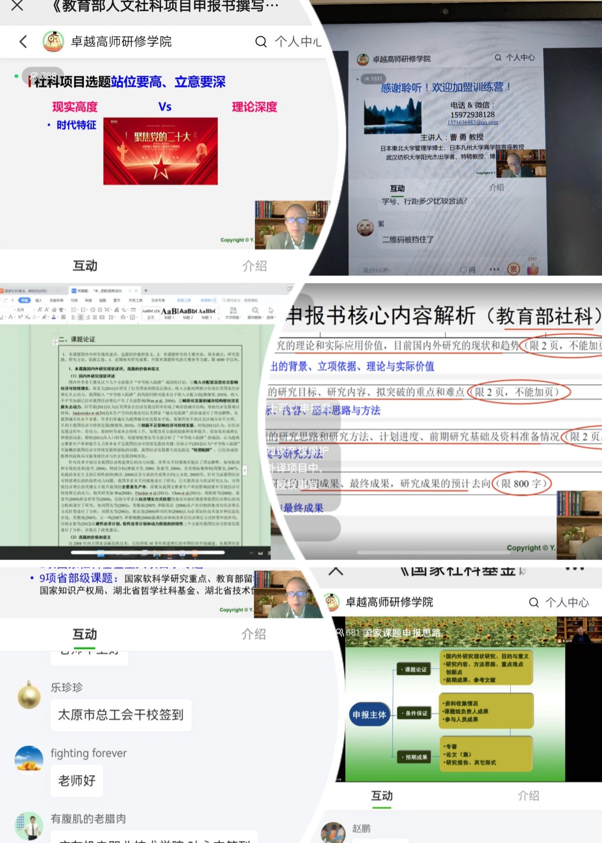 本次专题培训会为期两天,在线上举行,每天进行两场,每场均有一位业内专家进行专题报告。其中长沙理工大学马克思主义学院党委书记易显飞对国家社科基金项目选题与申报书撰写进行了指导;厦门大学的国家自然科学基金管理学部项目通讯评审专家、教育部社科基金重大和面上项目评审专家陈武元就国家社科基金项目申报的技巧及注意事项进行了分析;教育部纺织行业中外人文研究院的国家社科基金项目评审专家、教育部人文社科项目评审专家曹勇就教育部人文社科项目申报书的撰写注意事项与立项案例进行分享;东南大学的国家社科基金评审专家、国家社科基金后期资助评审专家李蓓蕾教授就国家社科基金项目课题申报思路与方法进行了深入讲解。