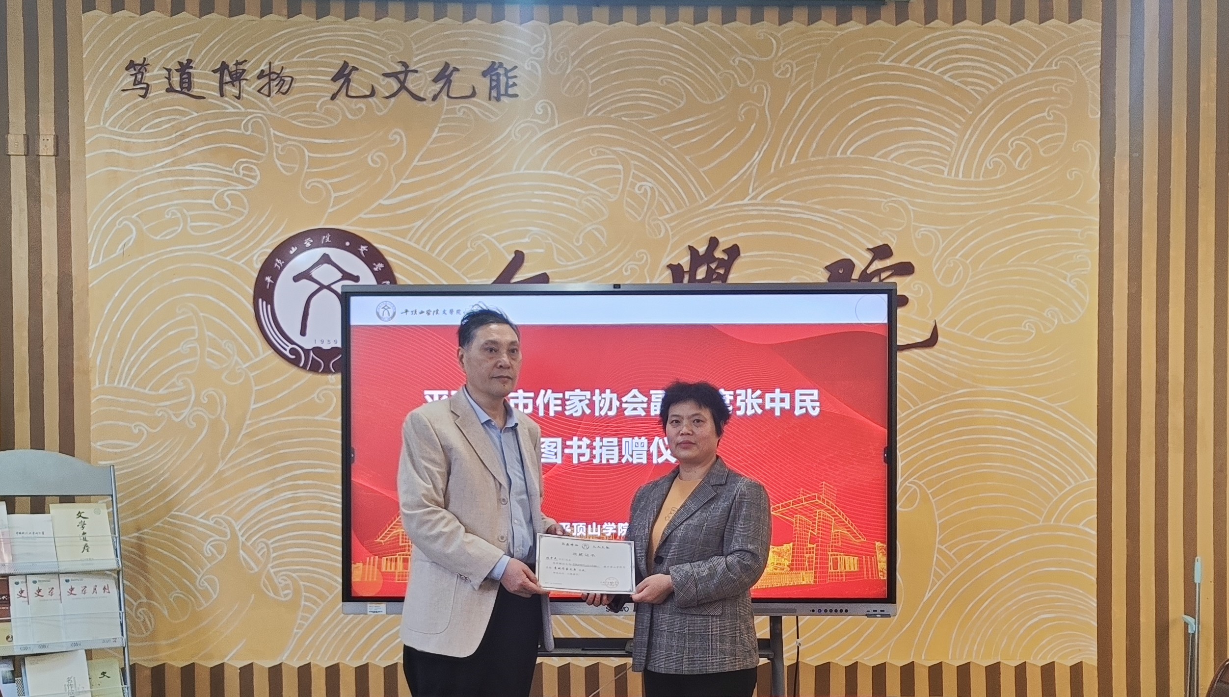 报告开始前,平顶山市作家协会副主席张中民图书捐赠仪式在我院1301会议室举行,张中民向文学院“鹰城作家文库”赠送其新近出版的长篇小说《远方有多远》,短篇小说集《奔跑的蚂蚁》,文学院副院长赵焕亭向张中民颁发了作品收藏证书。