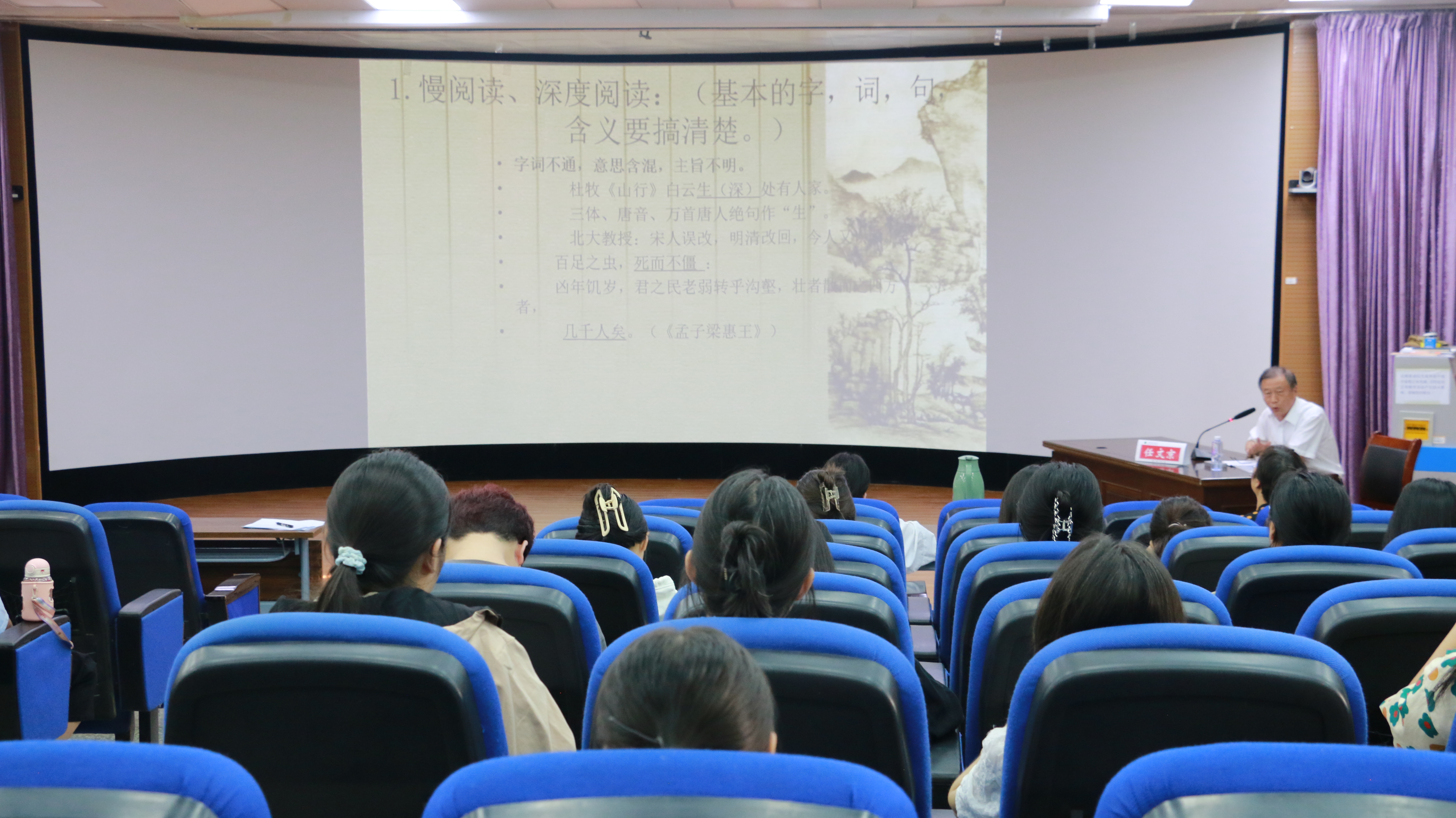 9月21日下午,河北大学博士生导师任文京教授在2106教室为全校师生作题为《古代文学研究中的文本细读》的专题报告。来自文学院2021级各专业的师生及全校其他院系的文学爱好者100多人参加了报告会。报告由文学院副院长赵焕亭主持。