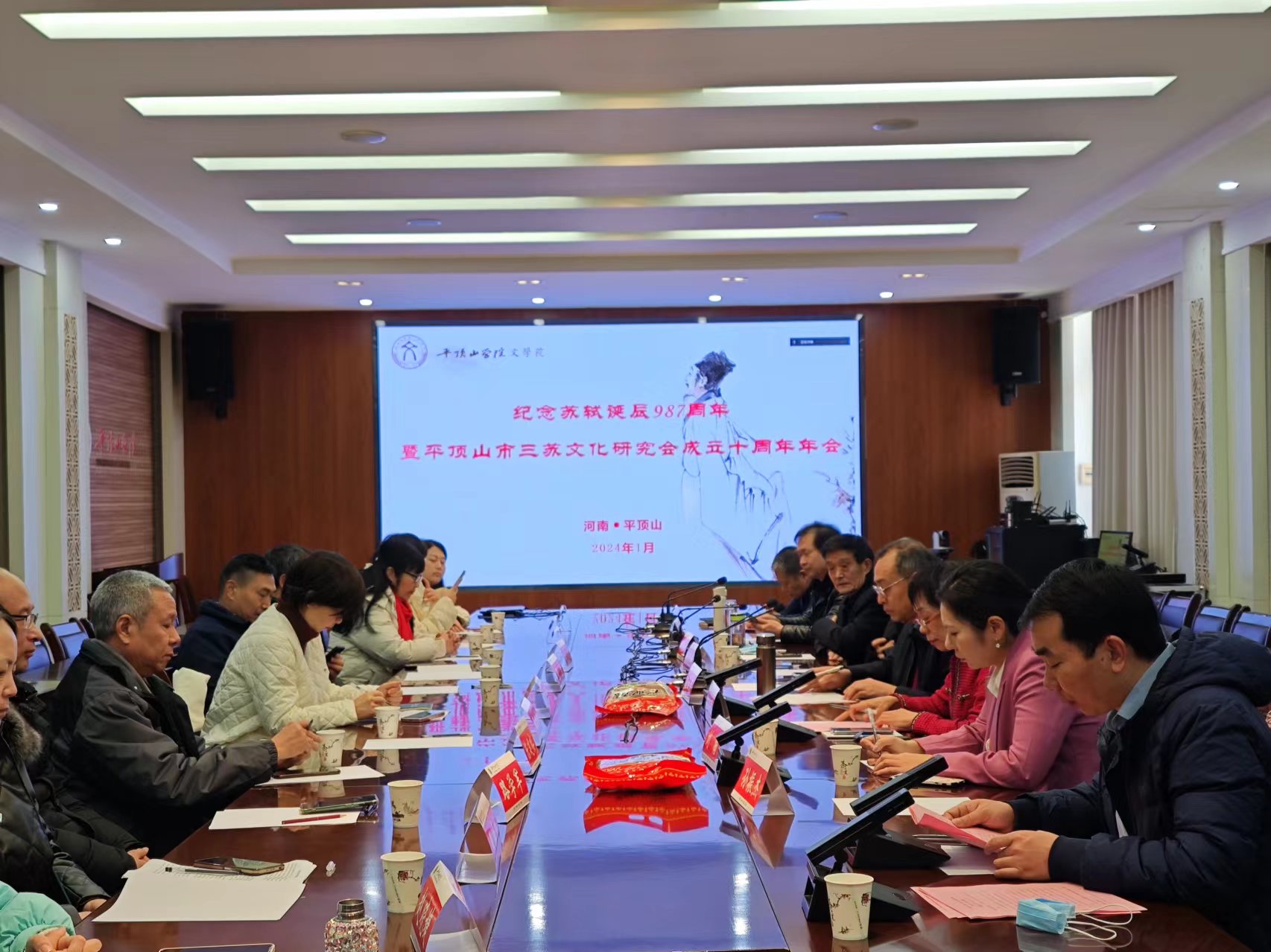 1月27日上午,以“习近平文化思想与三苏文化的传承创新”为主题的“纪念苏轼诞辰987周年暨平顶山市三苏文化研究会成立十周年年会”在我校办公楼329会议室召开。本次会议由平顶山市三苏文化研究会主办,平顶山学院文学院、伏牛山文化圈研究中心承办。平顶山市委宣传部一级调研员左玉昆,中国苏轼研究会常务理事刘继增,中国传媒大学传播研究院副教授、东坡乡村振兴书院院长刘楠,平顶山市三苏文化研究会会长、平顶山学院图书馆馆长何梅琴,平顶山学院伏牛山文化圈研究中心主任段纳,平顶山市三苏文化研究会副会长兼秘书长苏明奇,以及来自淮南师范学院、平顶山学院、平顶山市三苏文化研究会、郏县三苏园景区等国内研究三苏文化的专家学者20余人参加此次年会。会议由平顶山市三苏文化研究会副会长、平顶山学院文学院院长孙振杰主持。
