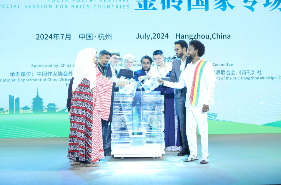 2024年7月19日,“首届国际青春诗会——金砖国家专场”在杭州开幕,10位诗人代表将“友谊之水”注入玉琮容器