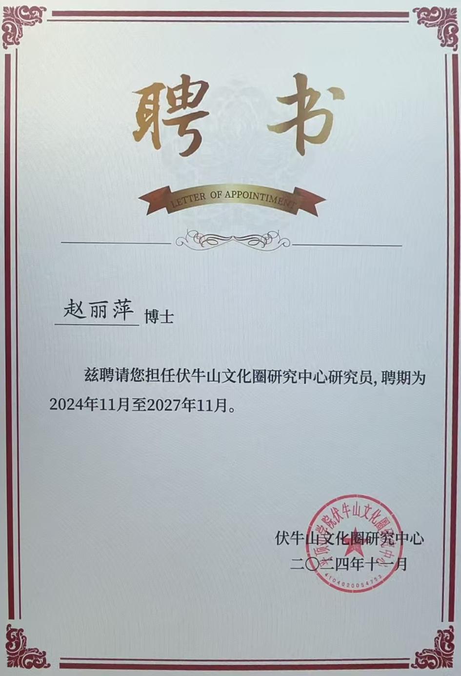 11月26日下午,伏牛山文化圈研究中心研究人员聘任仪式在学校行政楼403会议室举行,校党委书记、伏牛山文化圈研究中心智库负责人、首席专家华小鹏出席并讲话。在会上,科研处处长李光喜宣布了聘任13位博士为中心研究员的通知,我院青年教师赵丽萍博士名列其中。