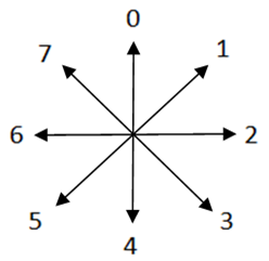 汉字的笔画分为平笔和曲折笔。平笔又称为单笔笔画,如一、㇀、丨、丿、丶。折笔因有折点,又称为复合笔画。复合笔画根据折点多少分为单折点(一个折点)笔画和复折点(两个或两个以上折点)笔画。联机手写汉字识别,在识别复合笔画时,需根据折点前、后笔画的方向变化来判别,即根据笔段的方向值识别复合笔画。笔段的方向值如下图: