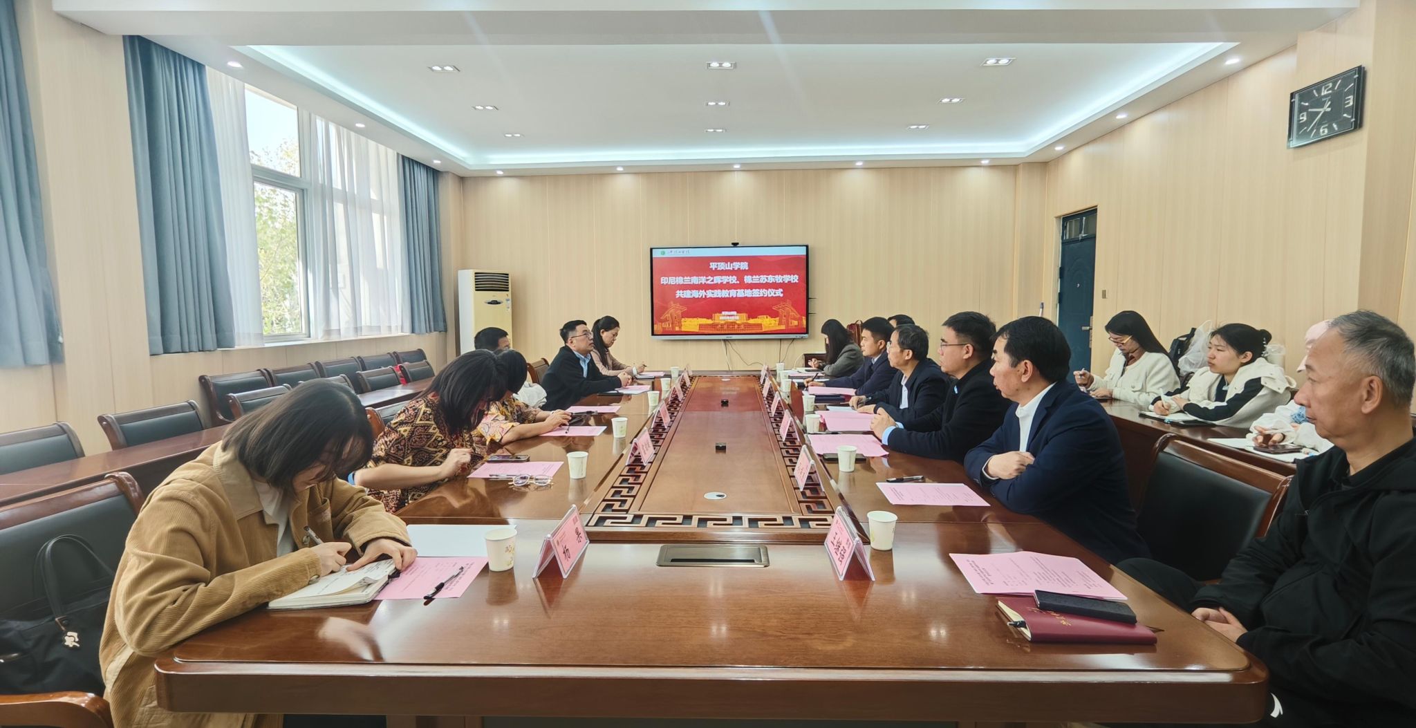 会上,平顶山学院与印尼华裔中华乐趣学苑签署了战略合作框架协议。学校文学院还分别与印尼棉兰南洋之晖学校和印尼棉兰苏东牧学校签订了共建海外实践教育基地协议。随后,双方与会人员就龙狮、陶瓷、中医康养等领域的合作,以及学校在印尼开展境外办学,开设“东坡书院”“陶瓷作坊”等“中文+”项目进行了深入探讨,并在很多方面达成了共识。