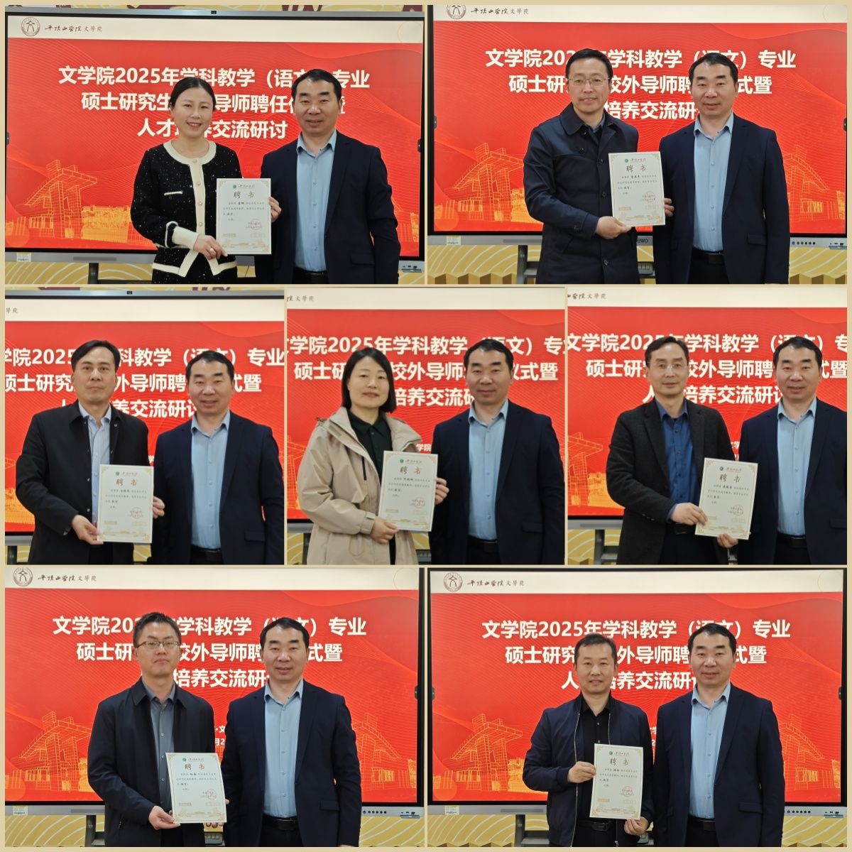 为加强校外导师队伍建设,深化院校协同育人机制,推动学科教学(语文)专业硕士人才培养高质量发展,3月22日上午,我院在1301会议室举办2025年学科教学(语文)专业硕士研究生校外导师聘任仪式暨人才培养交流研讨会。宝丰县第二初级中学党总支书记、校长牛凯辉,新华区实验小学党总支书记、校长安耀伟,平顶山市特殊教育学校党总支书记、校长袁俊吉,平顶山市第十六中党总支书记詹娜,平顶山市第四十中学校长曹亚东,平顶山市育才中学校长杨磊,平顶山市第九中学办公室主任梅林,平顶山学院文学院院长孙振杰等参加活动。仪式由文学院副院长杜彬彬主持。