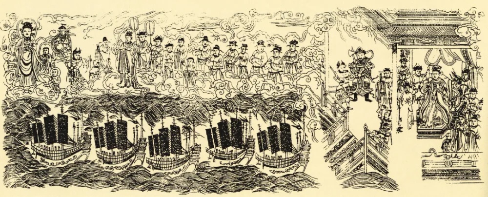 郑和下西洋船队图,收于2000年发现的《天妃经》(全称《太上说天妃救苦灵应经》,明永乐十八年刊刻,现藏北京图书馆)卷首插图中