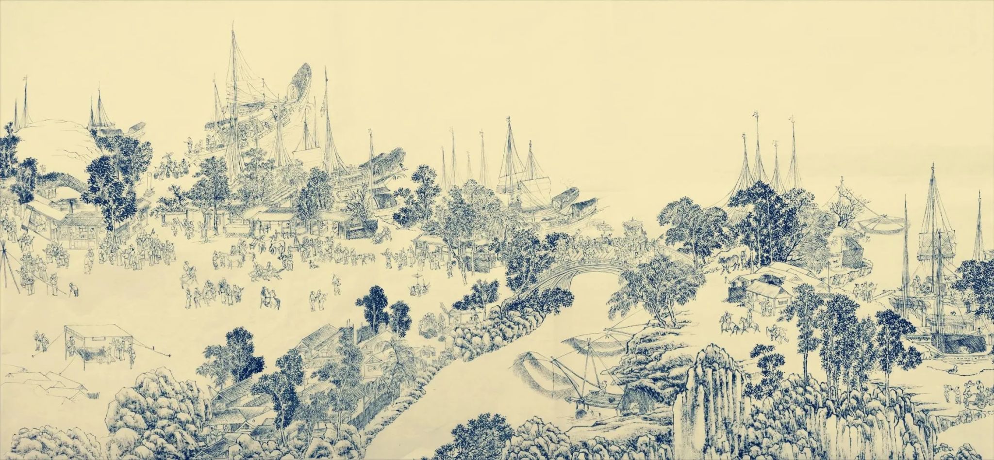 在故纸堆里搜寻海船历史图像时,我们发现先人对于海洋的关注古已有之。明代文伯仁《方壶图》描绘了古人向往的海上仙山,传为南宋刘松年所作的《海珍图》、清代聂璜《海错图》等勾勒出奇妙的海洋生物,敦煌壁画中则出现了多种类型的中式船舶……但在洋洋大观的中国古代绘画中,直接表现现实海洋图景的画作并不多见。传为元代王振鹏所作的《江山胜览图》是其中一件,作品通过描绘温州商港,反映了古代城市与海洋的关系。明代绘画仅有两件值得一说:一是明永乐十八年刊刻的《天妃经》,其插图中出现了郑和船队图像;一是中国国家博物馆藏《抗倭图》卷,表现了海战的激烈场景。