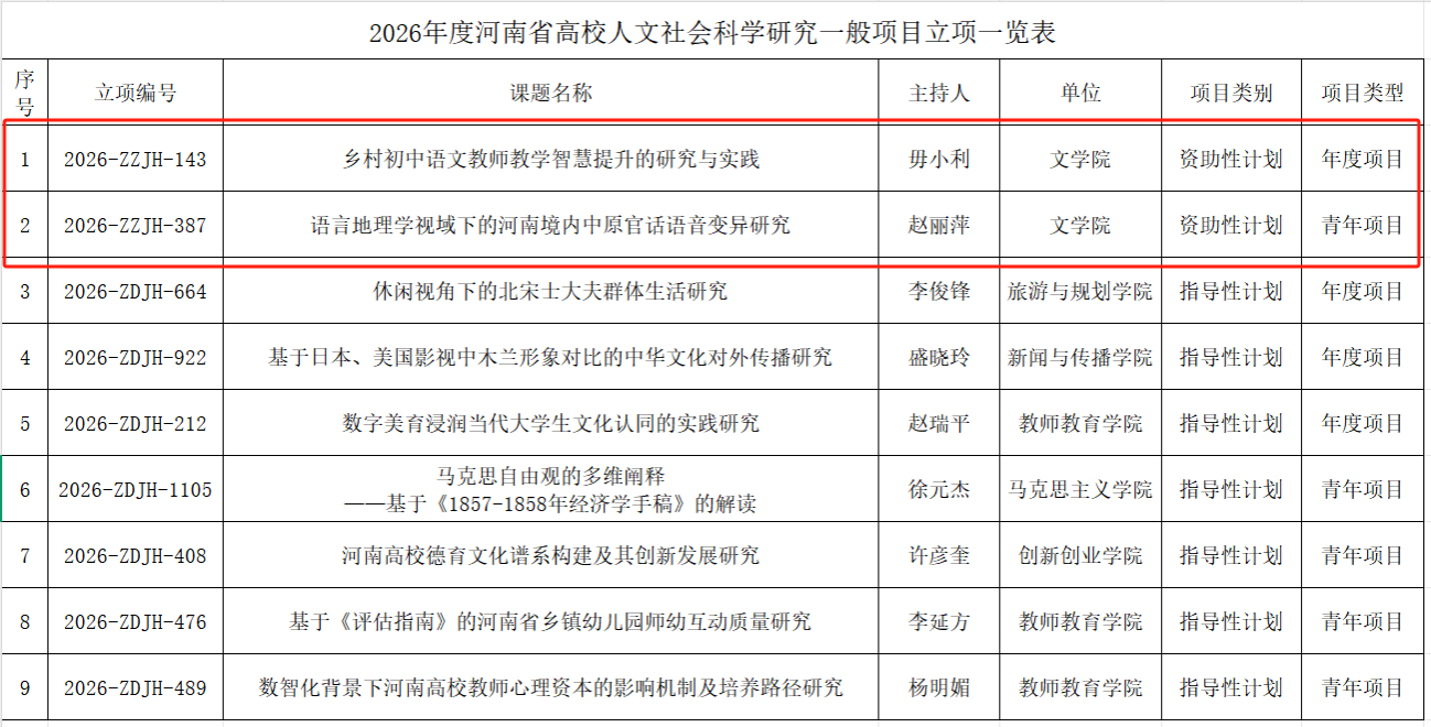近日,《河南省教育厅关于下达2026年度河南省高校人文社会科学研究一般项目立项计划的通知》(教社语〔2025〕147号)公布,我院毋小利教授、赵丽萍博士获批资助性计划立项,每项将获得省财政专项资助2万元。