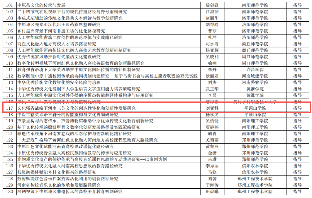 近日,河南省教工委公布了2026年度河南省教育强省专项研究项目立项结果,我院教师刘亚科的《文化强省战略下河南三苏文化的创造性转化和创新性发展研究》获批指导性计划立项。
