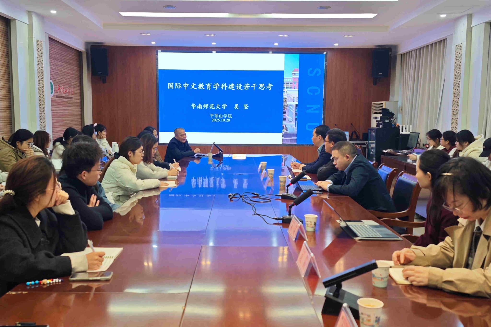 孙振杰代表学校致欢迎辞,向来访客人简要介绍了我校及文学院汉语国际教育专业发展情况和学科规划。随后,吴坚教授以“国际中文教育学科建设若干思考”为题作学术报告。他系统梳理了国际中文教育学科的发展脉络与核心议题,深入分析了新时代背景下国际中文教育学科建设面临的新态势,剖析了数字化、智能化技术引发的教学方式的深刻变革,指出了当前国际中文教育学科发展蕴含的机遇和需要应对的挑战,并通过具体数据详细阐述了推动国际中文教育学科未来发展的可行路径与实践策略。他强调,面对全球中文学习需求持续增长的良好机遇,国际中文教育工作者应构建跨学科知识体系,完善质量标准建设,深化中外协同合作,推动国际中文教育学科发展,为区域协同发展贡献力量。