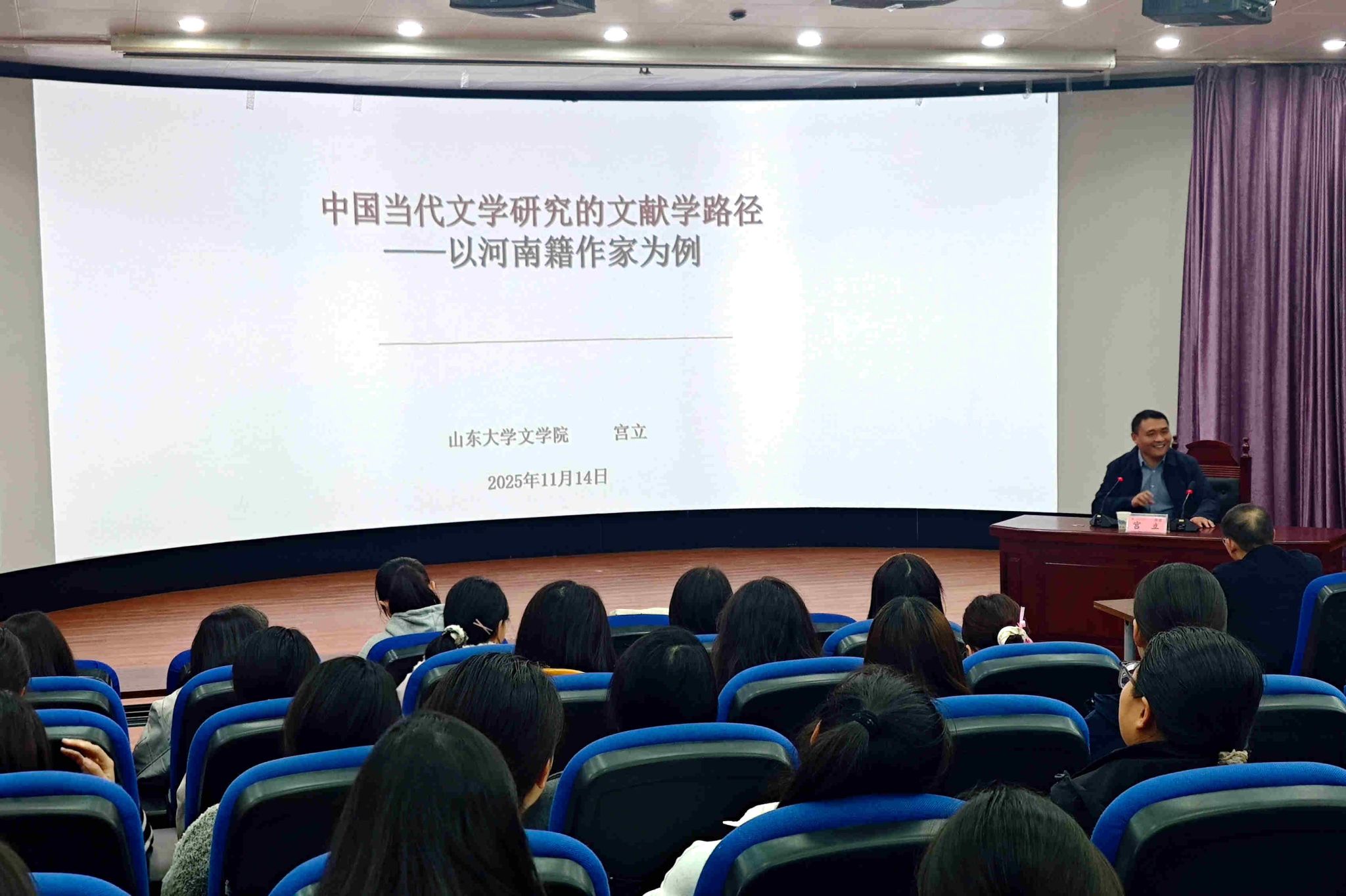11月14日下午,山东大学博士生导师宫立教授应邀在2106教室为我校师生作了题为“中国当代文学研究的文献路径——以河南籍作家为例”的学术报告。《平顶山学院学报》编辑部负责人、中国现当代文学省级重点学科成员及文学院各年级学生100余人参加报告会。报告会由文学院副院长杜彬彬主持。
