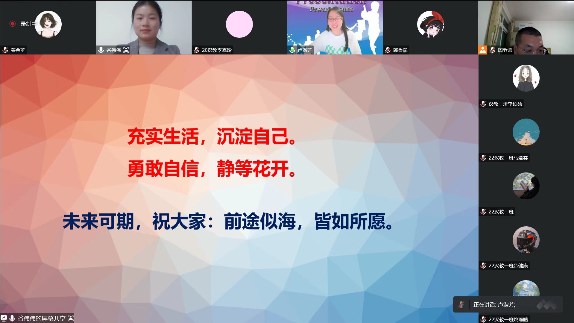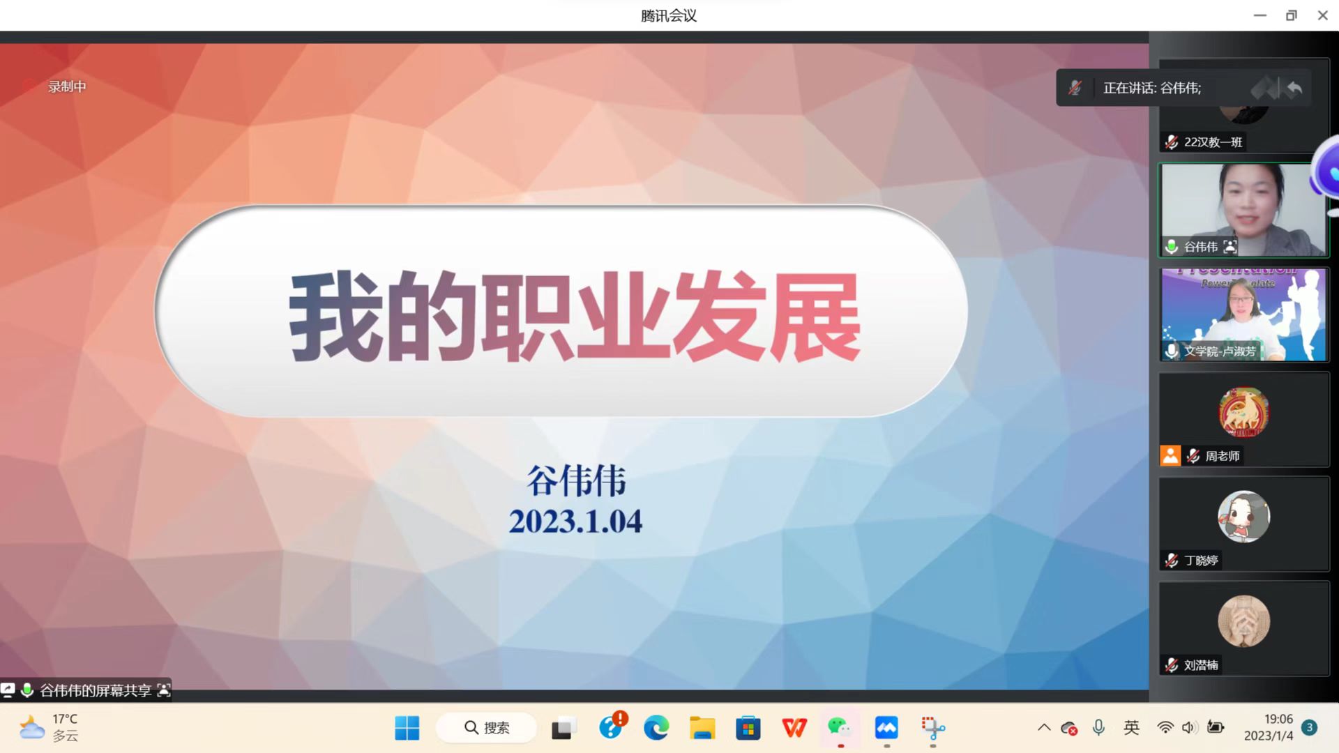 1月4日,文学院专业实习系列讲座(第6场)在腾讯会议举行,此次讲座邀请2015届对外汉语专业毕业生谷伟伟以“我的职业发展”为主题作分享报告。文学院汉语国际教育专业师生参加报告会。报告会由文学院语言教研室主任卢淑芳主持。