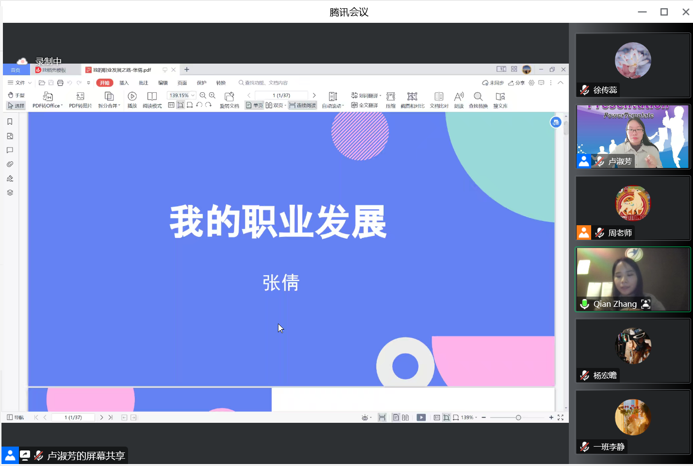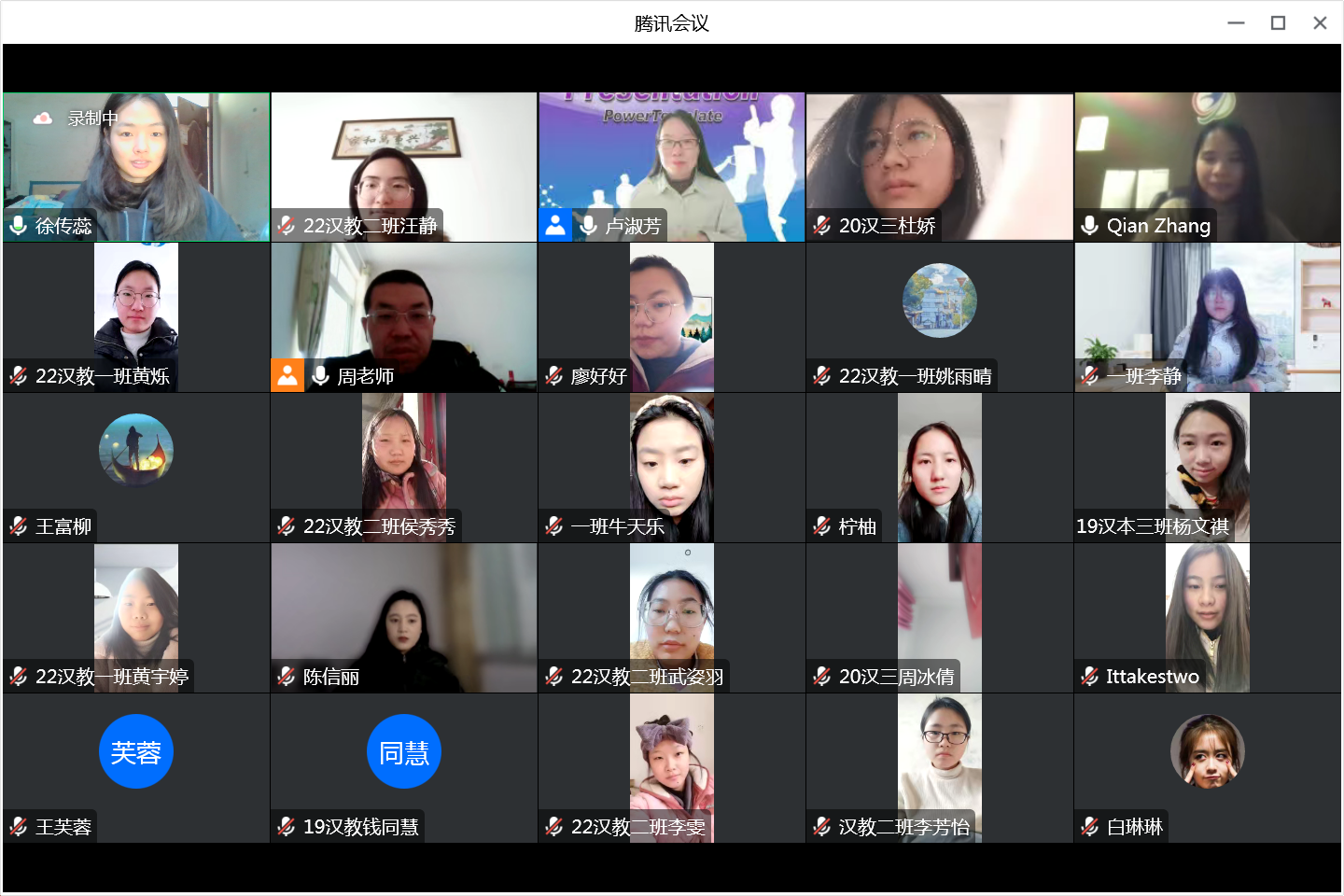 12月28日,文学院专业实习系列讲座(第5场)在腾讯会议举行,本次邀请2014届对外汉语专业毕业生张倩以“我的职业发展”为主题作了分享报告。文学院2019级汉语国际教育、汉语言文学专业及其他年级专业学生140余人参加了报告。报告由文学院语言教研室主任卢淑芳主持。