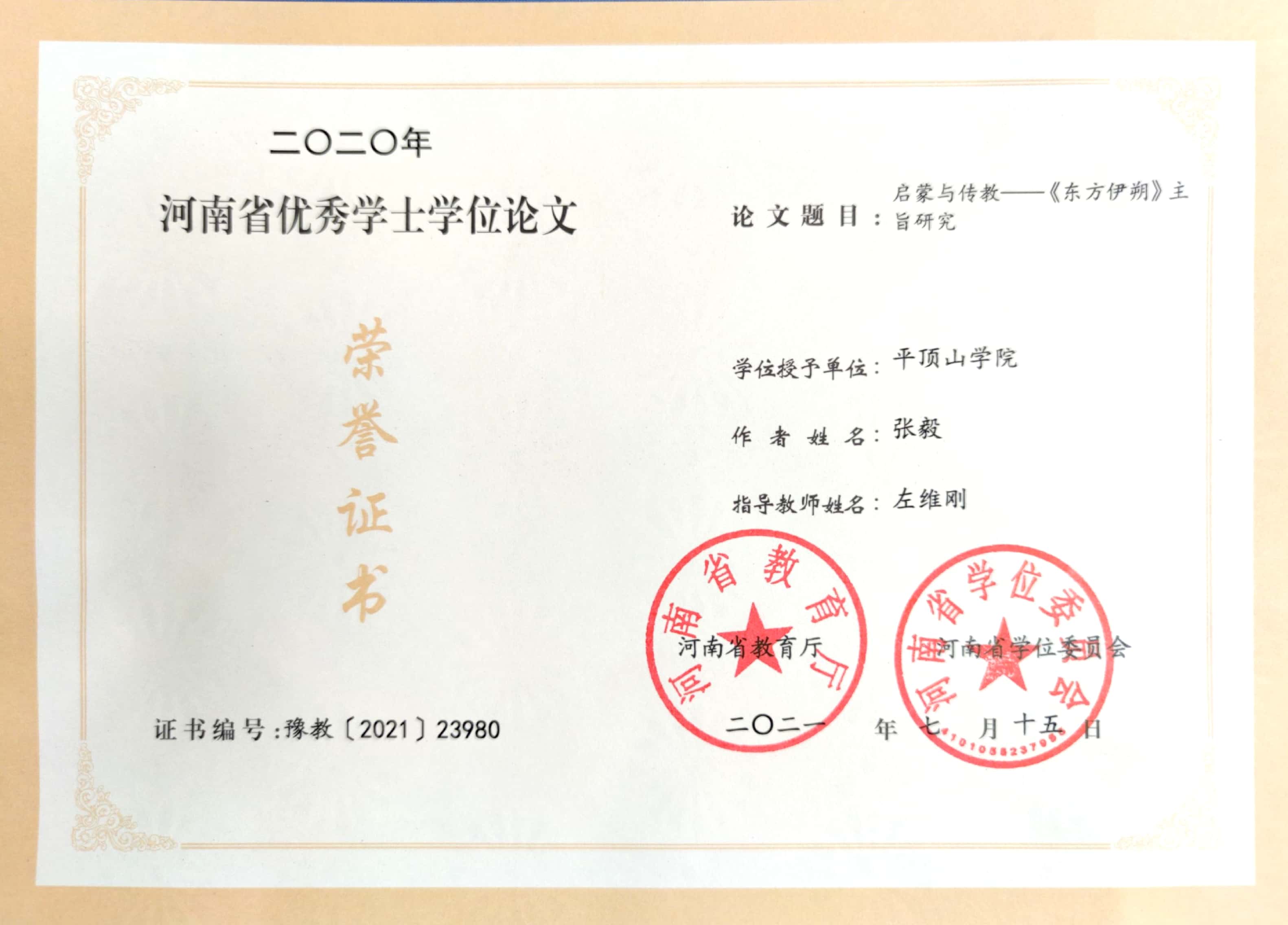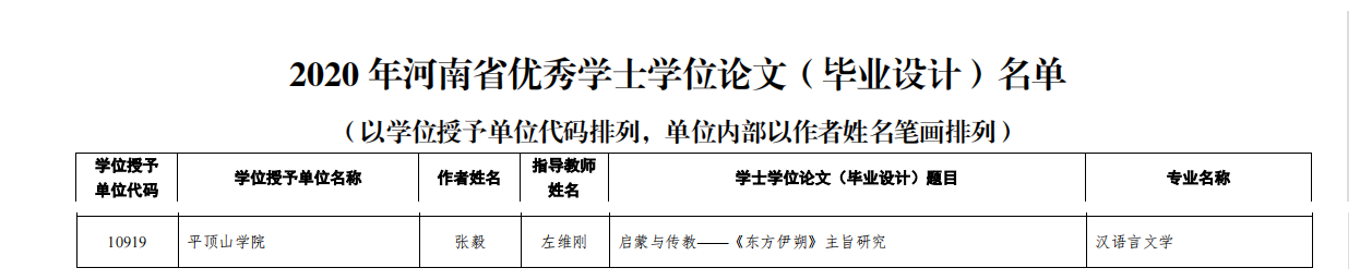 近日,河南省学位委员会办公室公布了2020年河南省优秀学位论文评选结果,由文学院教师左维刚指导,汉语言文学专业2020届毕业生张毅撰写的《启蒙与传教——<东方伊朔>主旨研究》获评2020年河南省优秀学士学位论文。
