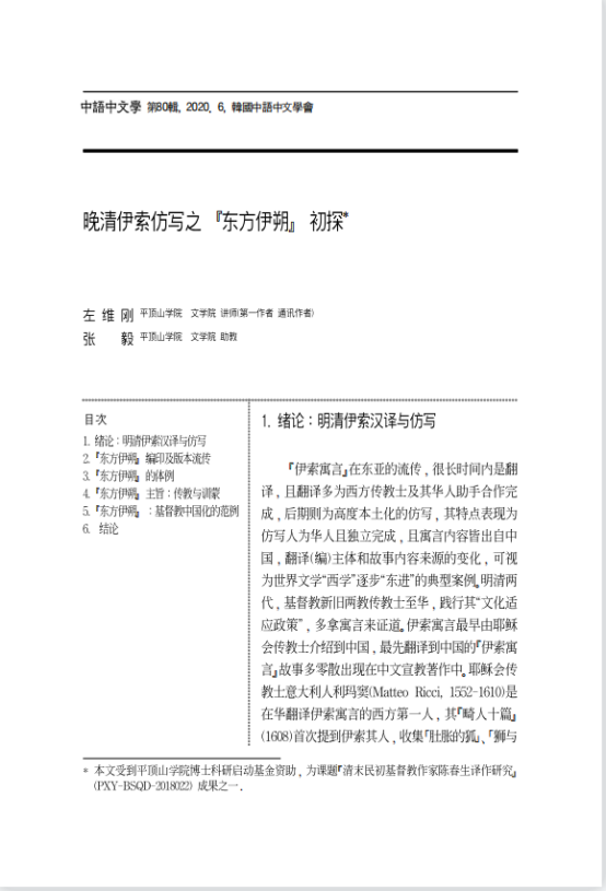 左维刚,韩国崇实大学博士,主要研究中外经典互译、近现代作家作品及其对外传播。《启蒙与传教——<东方伊朔>主旨研究》经过修改,发表在韩国kci核心刊物《中语中文学》2020年6期。