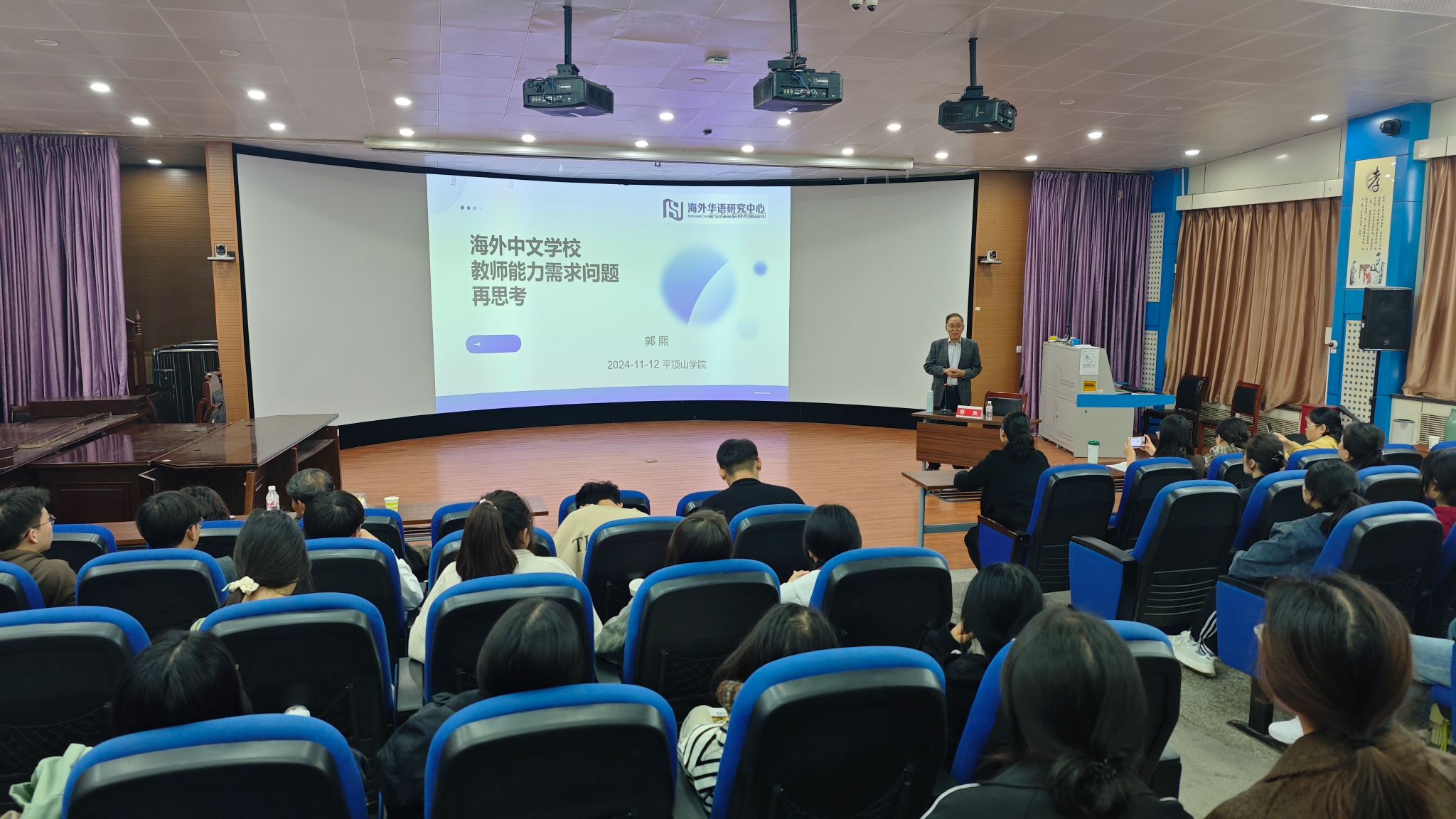 11月11日下午,国家语委海外华语研究中心主任、我院77级校友郭熙教授应邀在2106教室作了题为《海外中文学校教师能力需求问题再思考》的专题报告。平顶山市政府侨办,我校国际交流与合作中心、伏牛山文化圈研究中心、文学院、新闻与传播学院负责人及相关专业师生120余人参加报告会。报告会由文学院副院长杜彬彬主持。