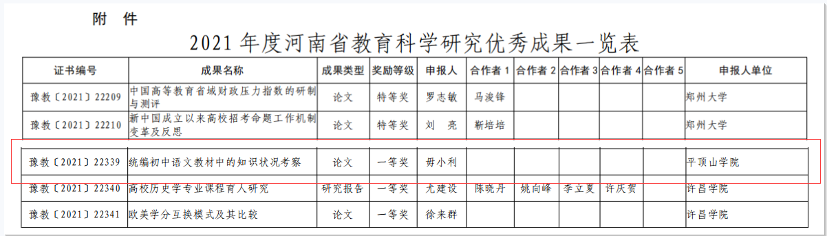 近日,河南省教育厅发布《关于公布2021年度河南省教育科学研究优秀成果的通知》(教教科〔2021〕249号),我院毋小利教授的论文《统编初中语文教材中的知识状况考察》荣获河南省教育科学研究优秀成果一等奖。