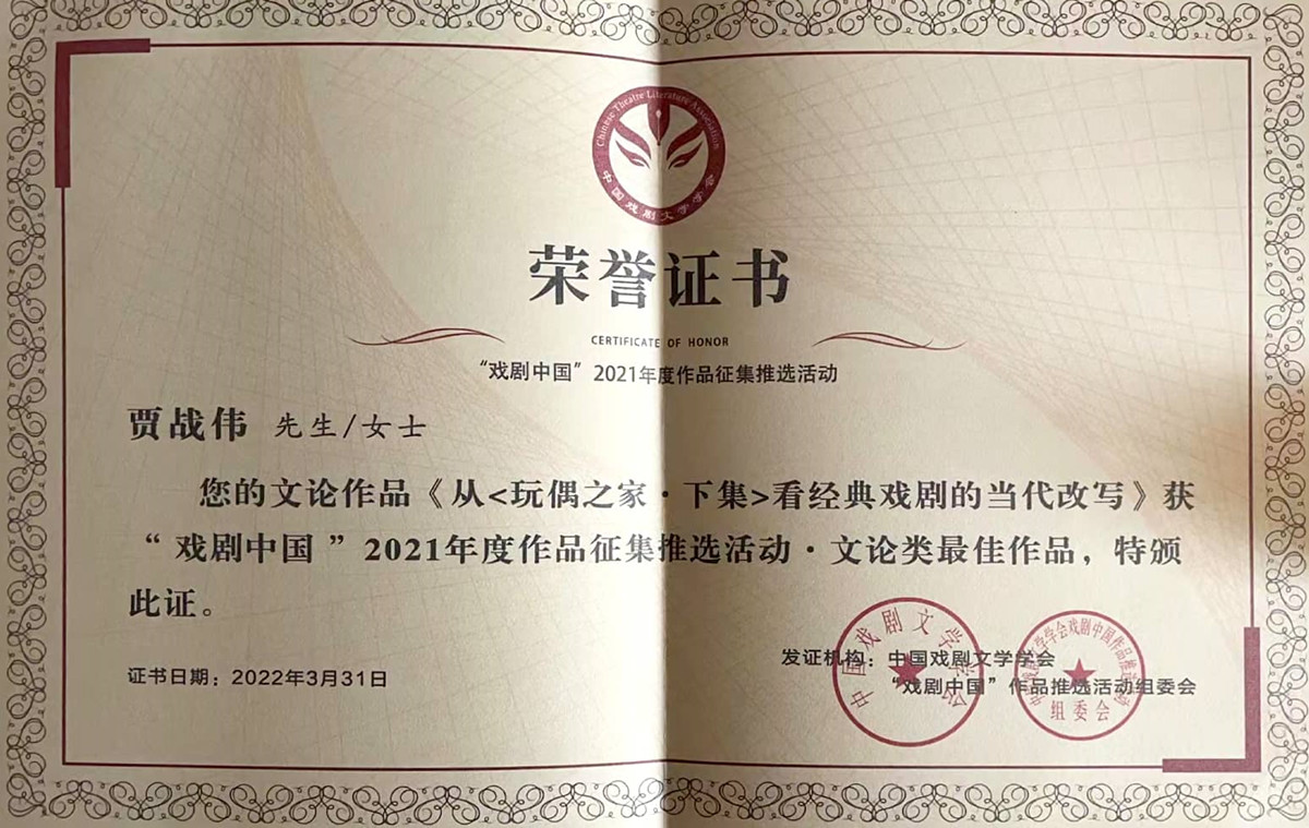 近日,“戏剧中国”2021年度作品征集推选活动证书颁发仪式及2021年度优秀剧目线上展演证书颁发礼在山东省济南市章丘区石匣村举行,文学院教师贾战伟的文论作品《从<玩偶之家·下集>看经典戏剧的当代改写》获评文论类最佳作品。