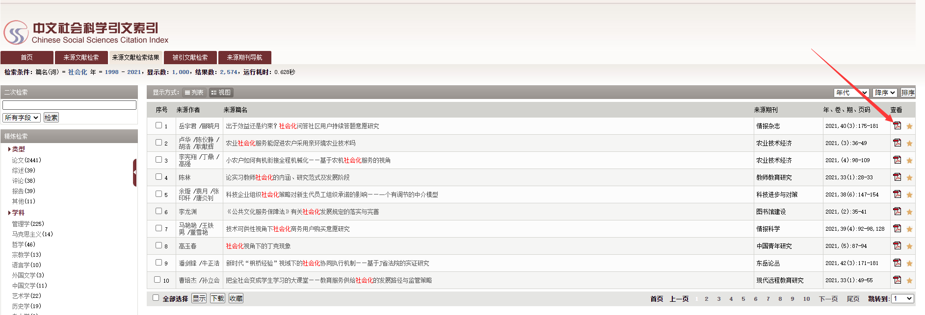 在检索结果页面出现后,点击所需文献“查看”栏中的PDF图标,或在“来源文献详细页”点击文献名后的PDF图标,页面将自动跳转至“百度学术”的全文文献获取页面。