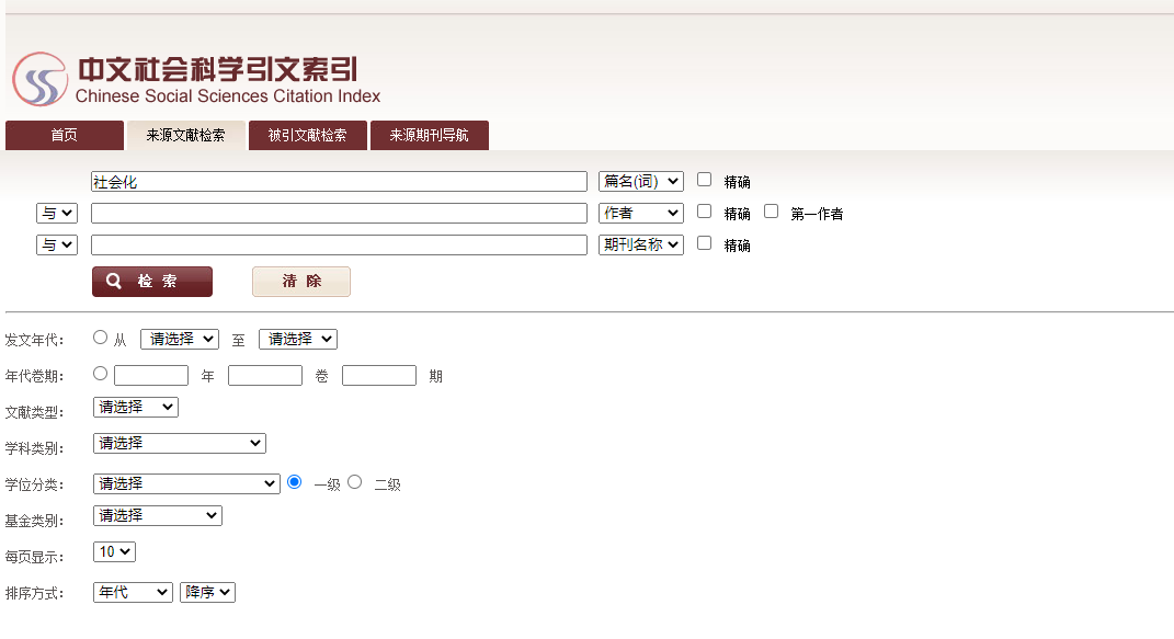 进入CSSCI数据库(http://cssci.nju.edu.cn)来源文献检索页面,输入需要检索的关键词、篇名、作者、期刊名称等。