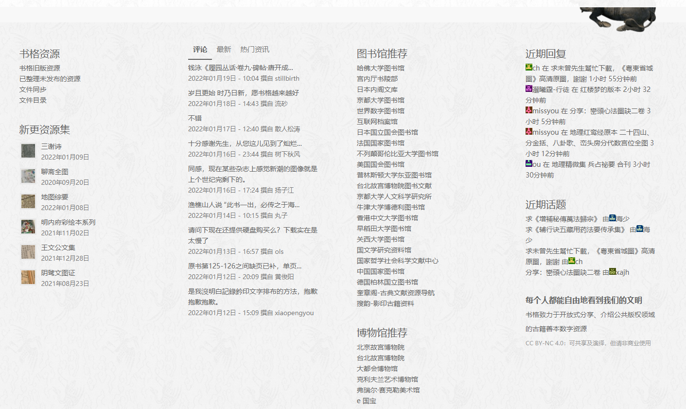 书格是一个年轻的数字古籍收集网站,页面设计简约大方,所有资源都是书格的主人在各大图书馆下载,再制作成pdf上传的。每部古籍在详情页都有配图和内容介绍,主页还有丰富的网址链接。