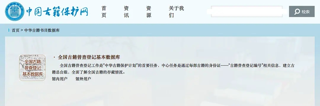 首页是中国古籍保护网(http://wza.xinhuanet.com/yxsm/index.php?m=proxy&a=show&q_url=http%3A%2F%2Fwww.nlc.cn%2Fpcab%2F )点击“中华古籍书目数据库”就可以来到全国古籍普查登记基本数据库的入口。