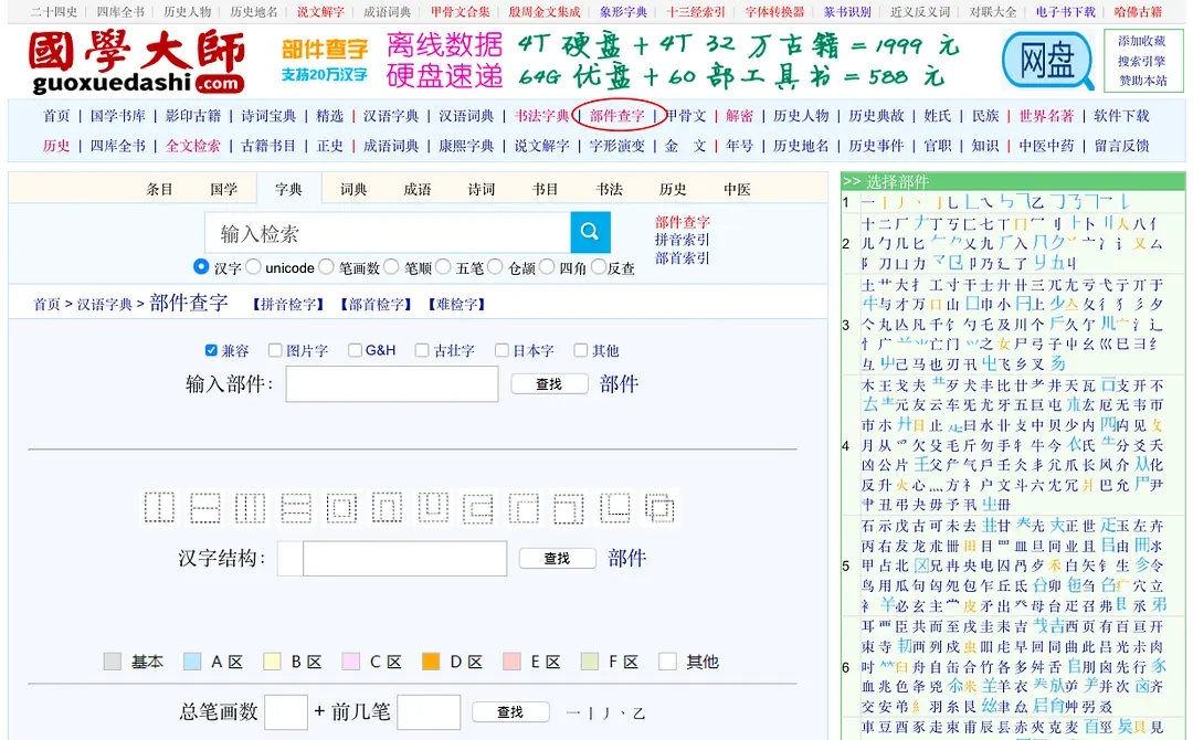 最常用的字词查询工具,涵盖了《汉语大字典》《字源》《说文解字》《古文字诂林》《书法字典》等数十部工具书,并有专门的“异体字”和“字形演变”栏目,方便直观。对于输入法打不出来的字,可以使用“部件查字”的方法,通过输入汉字部件,选择汉字结构的方法进行搜索。