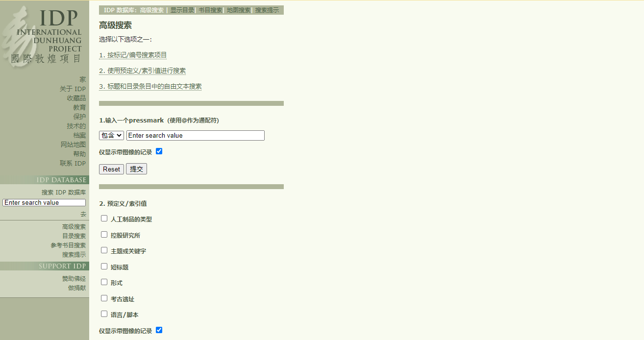 敦煌研究项目(IDP)收录了中、英、法、日、俄等多国所藏的敦煌文献。搜索框在页面左边,输入敦煌卷子编号即可进行检索。