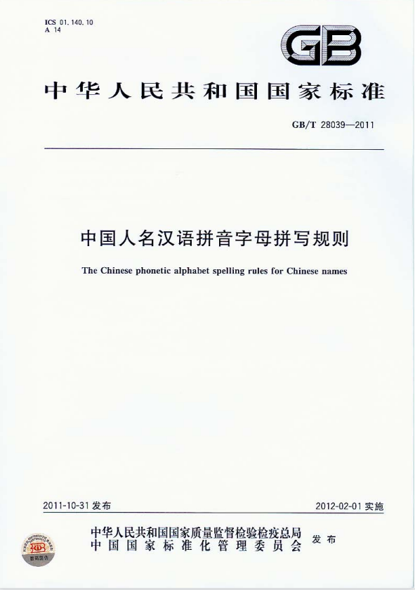 标准规范 | 中国人名汉语拼音字母拼写规则