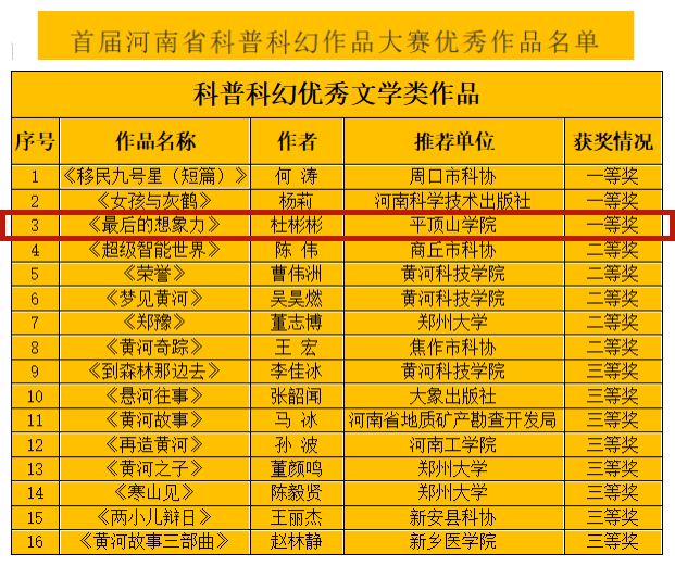近日,河南省科学技术协会对2021年首届河南省科普科幻作品大赛获奖结果进行公示,文学院教师杜彬彬创作的《最后的想象力》获科普科幻优秀文学类作品一等奖。