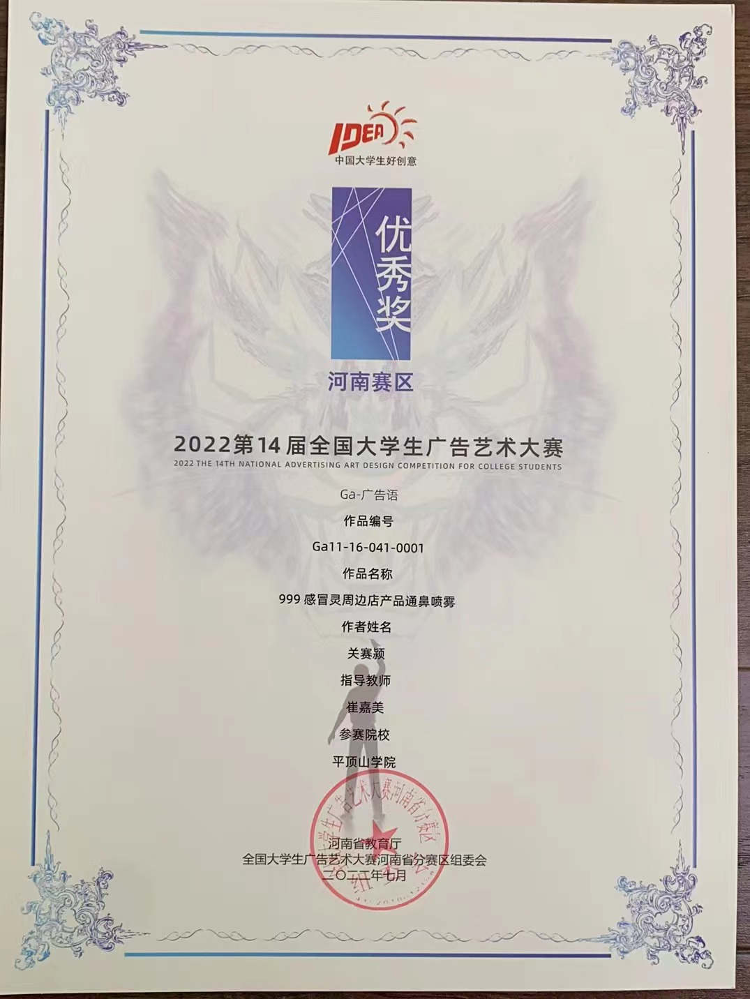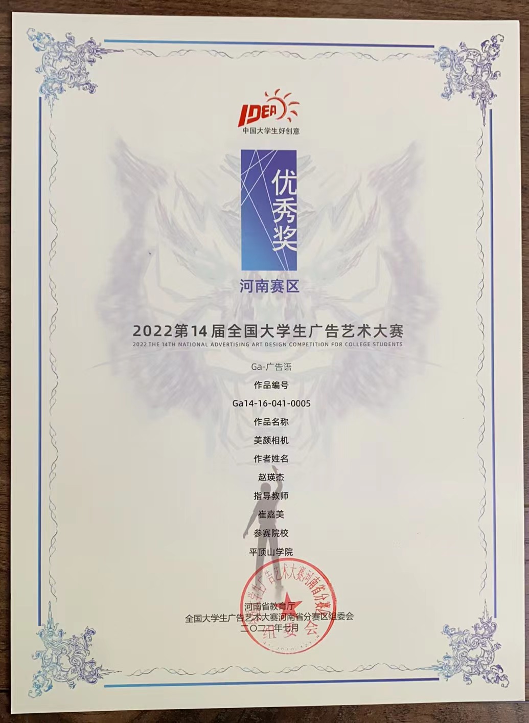 2022年9月,全国大学生广告艺术大赛组委会公布了第14届全国大学生广告艺术大赛及河南省分赛区获奖名单,文学院教师崔嘉美指导,2019级戏剧影视文学专业学生赵瑛杰编写的广告语《美颜相机》获文案广告语类国家级优秀奖;文学院教师崔嘉美指导,2019级戏剧影视文学专业学生关赛颖编写的广告语《999感冒灵周边店产品通鼻喷雾》获河南赛区文案广告类优秀奖。