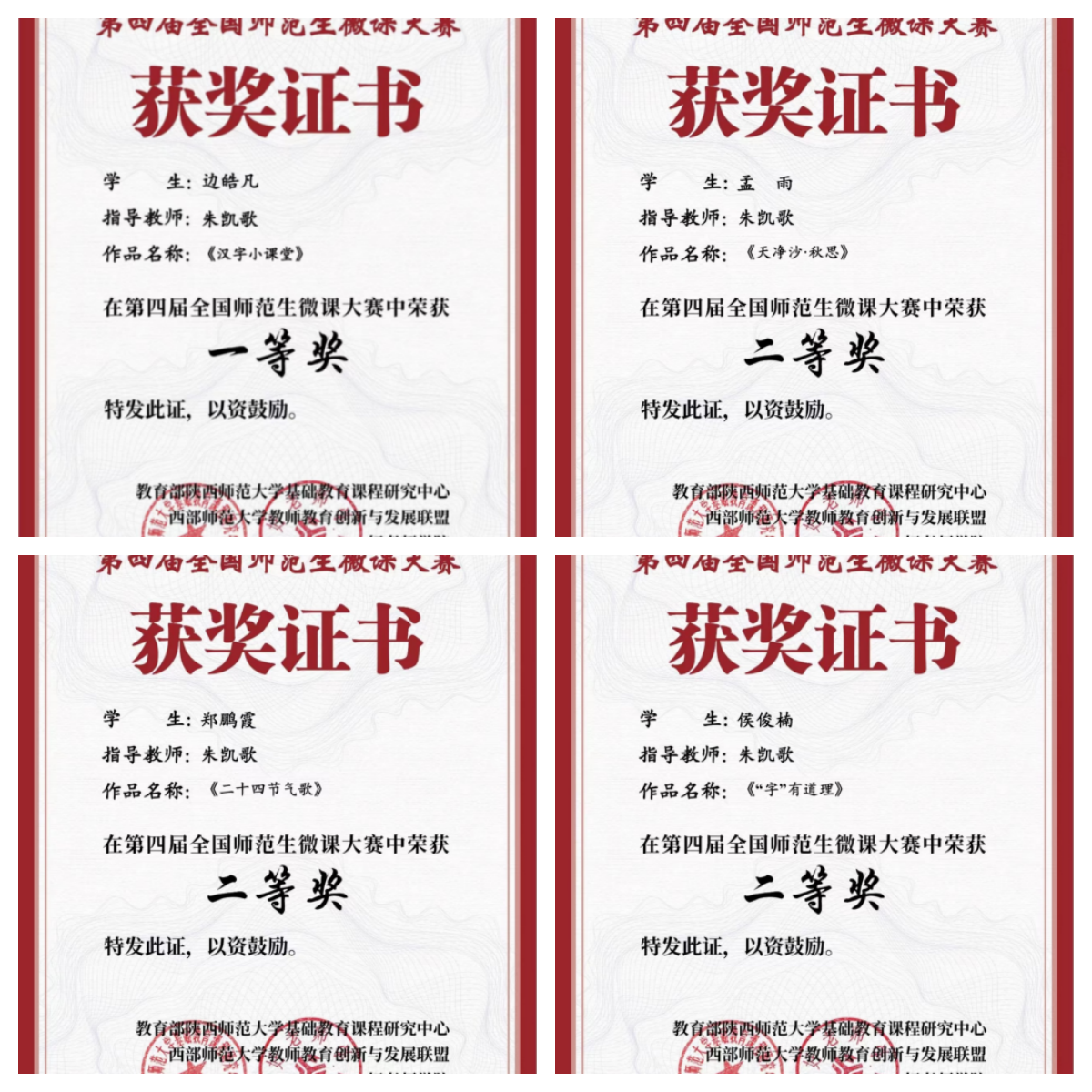 近日,全国师范生微课大赛组委会公布了第四届全国师范生微课大赛获奖名单。由我院朱凯歌老师指导,2020级汉语言文学专业边皓凡的微课作品《汉字小课堂》获一等奖,孟雨的《天净沙·秋思》、郑鹏霞的《二十四节气歌》、侯俊楠的《“字”有道理》、2020级戏剧影视文学专业王卫湘的《百变的汉字用法》获二等奖;秦玉莲老师指导,2020级汉语言文学专业成彬彬的《白杨礼赞之象征手法》获二等奖,赵燕飞老师指导,王永慧的《iu和ui趣分》获二等奖。