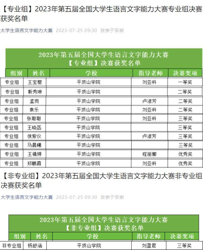 全国大学生语言文字能力大赛每年举办一次,设专业组、非专业组、专科组三个组别。大赛分初赛、决赛,初赛主要考察语言文字理论知识,决赛考察内容包括命题写作、普通话朗读、硬笔字书写三项。大赛到今年已经举办五届,我校系首次参赛。比赛通知公布后,我院以语言教研室专业教师为指导团队,积极动员学生,悉心指导,6月17日,我校各专业96名同学参加了大赛初赛,与全国1340多所高校的2万多名学生同台竞技,最终有43人获专业组一、二、三等奖,15人获非专业组一、二、三等奖。