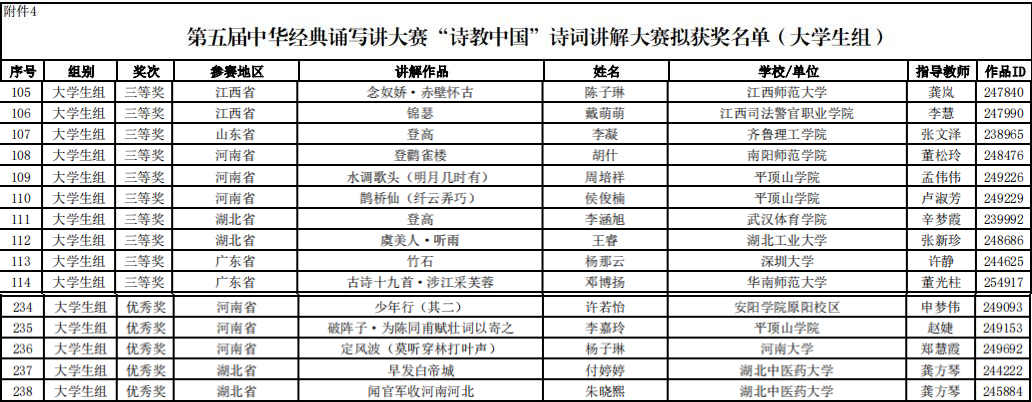根据《教育部办公厅关于举办第五届中华经典诵写讲大赛的通知》(教语用厅函〔2023〕2号)要求,我院积极动员学生参赛,来自文学院、经济管理学院、数学与统计学院的20多名学生参加了初赛、复赛。我院选派专业教师,为参赛学生做了多次针对性指导,使得他们在古诗词鉴赏和讲解上取得了显著进步,最终有3名学生闯进复赛并获奖。