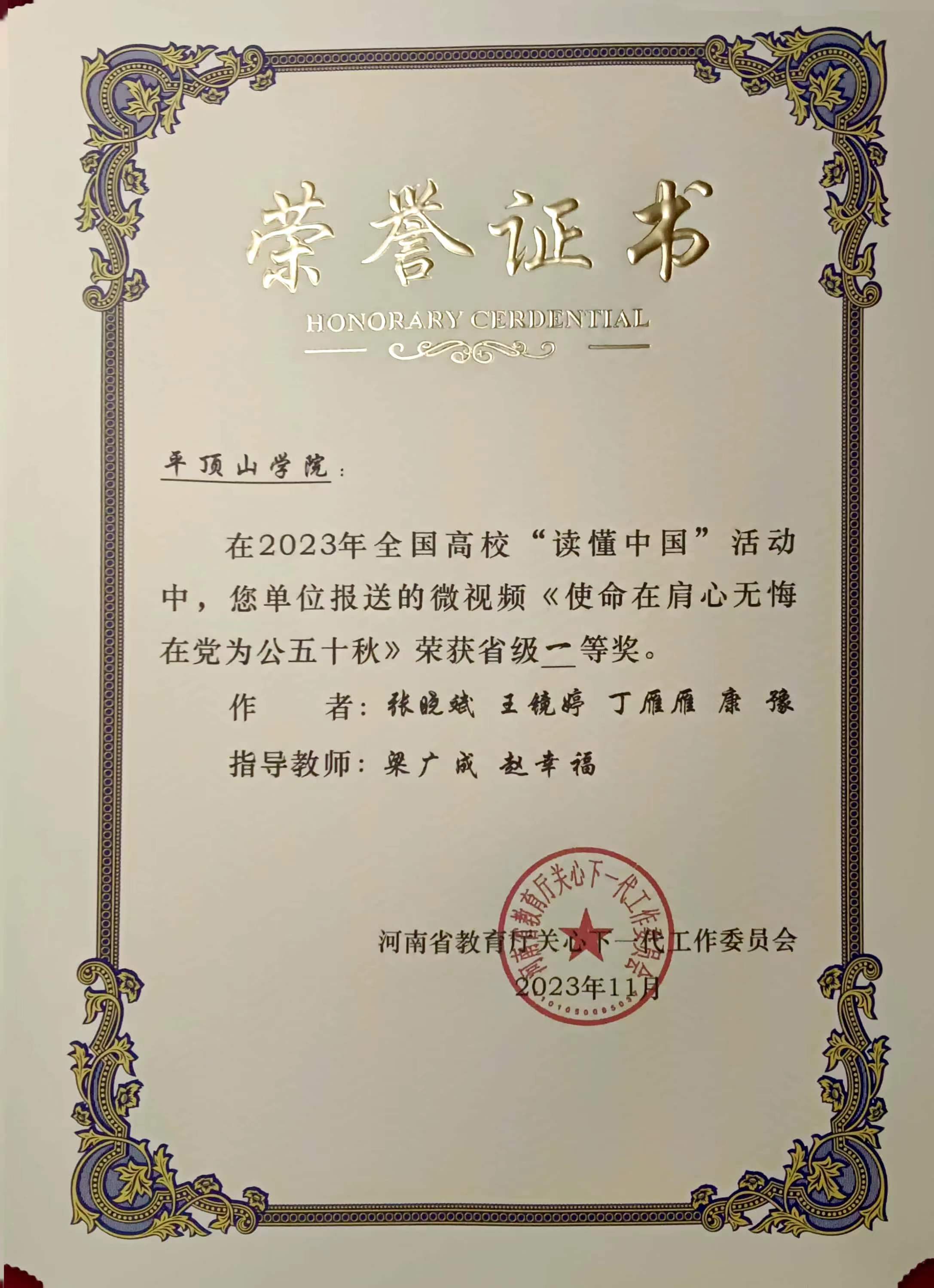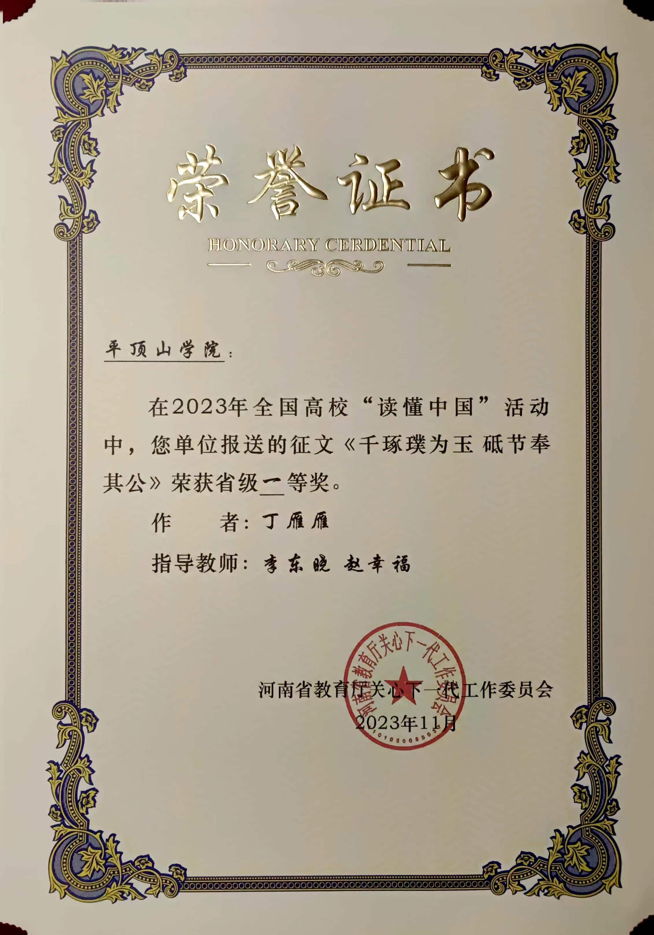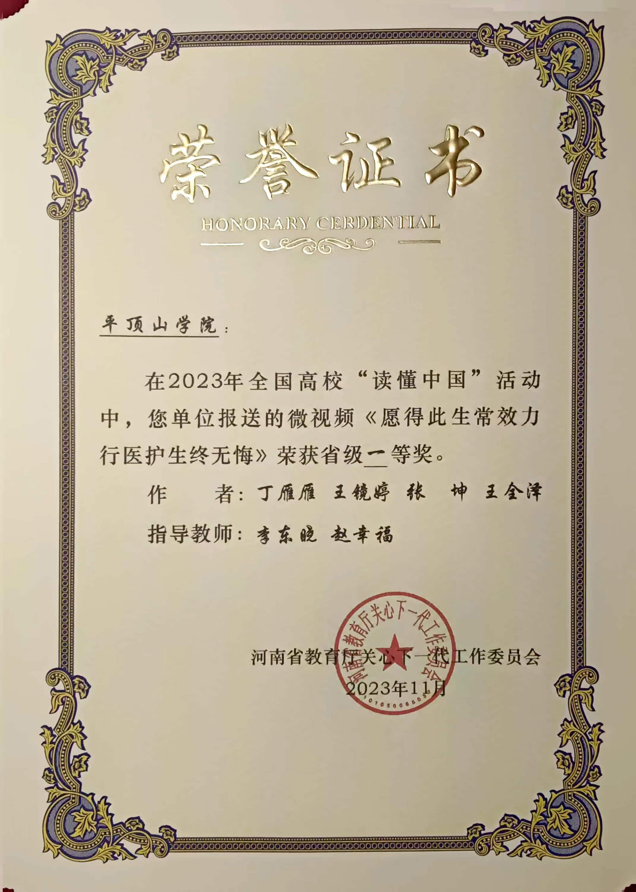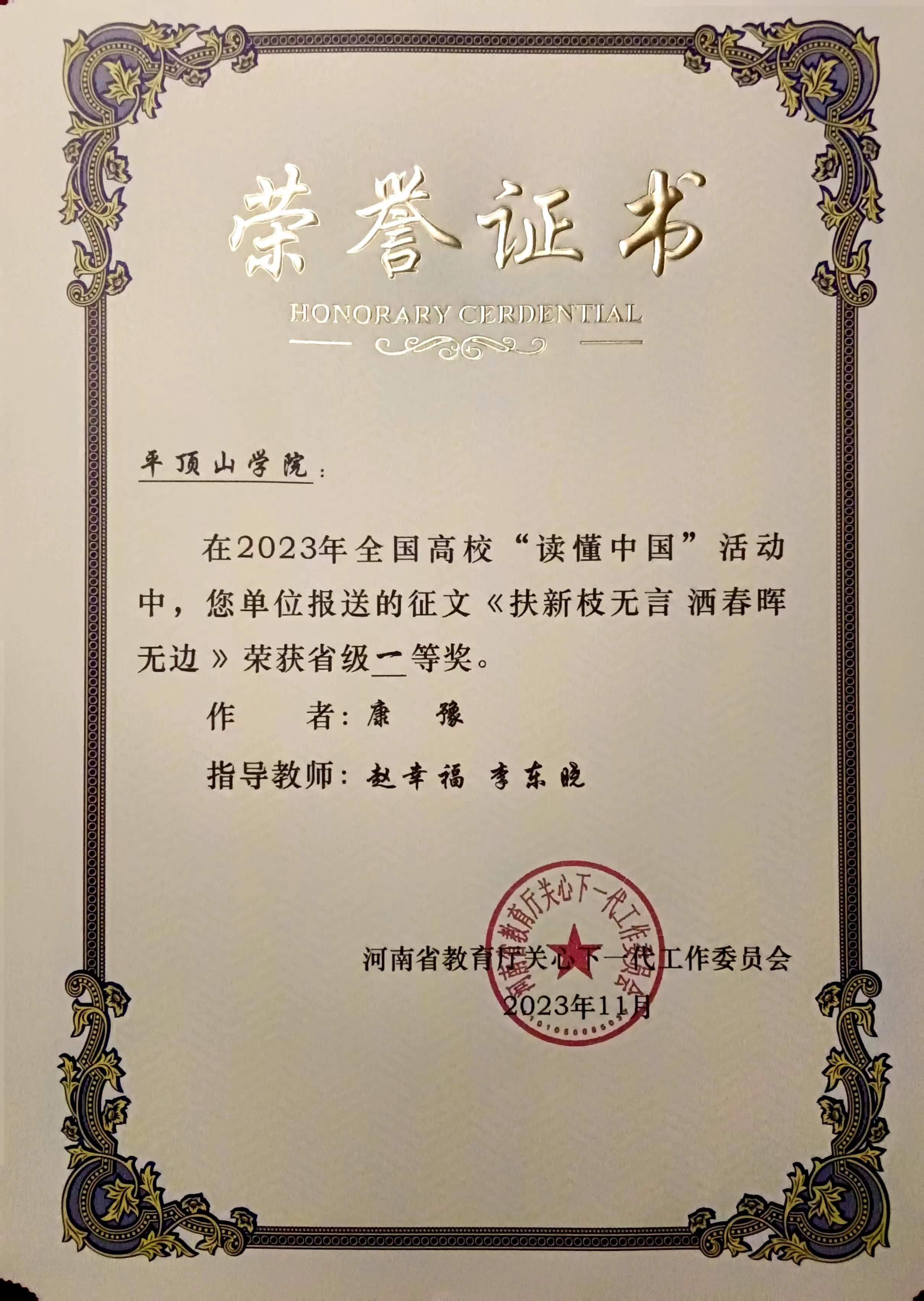 近日,河南省教育厅关心下一代委员会印发《关于公布全省高校“读懂中国”活动评审结果的通知》(豫教关[2023]25号),由我院李东晓老师指导,丁雁雁撰写的《千琢璞为玉 砥节奉其公》、康豫撰写的《扶新枝无言 洒春晖无边》荣获征文类一等奖;由李东晓老师参与指导,2020级、2021级汉语言文学专业学生王镜婷、丁雁雁、康豫参与创作的微视频作品《使命在肩心无悔 在党为公五十秋》《愿得此生常效力 行医护生终无悔》荣获微视频类一等奖。
