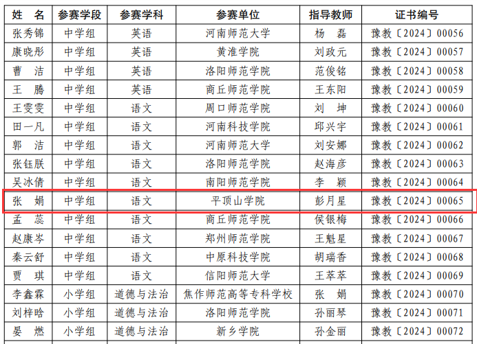 近日,河南省教育厅公布了第二十一届高等学校师范类专业毕业生教学技能比赛获奖结果,我院2020级汉语言文学专业张娟获中学组语文学科一等奖,2020级汉语言文学专业边皓凡获三等奖,彭月星老师获优秀辅导奖。