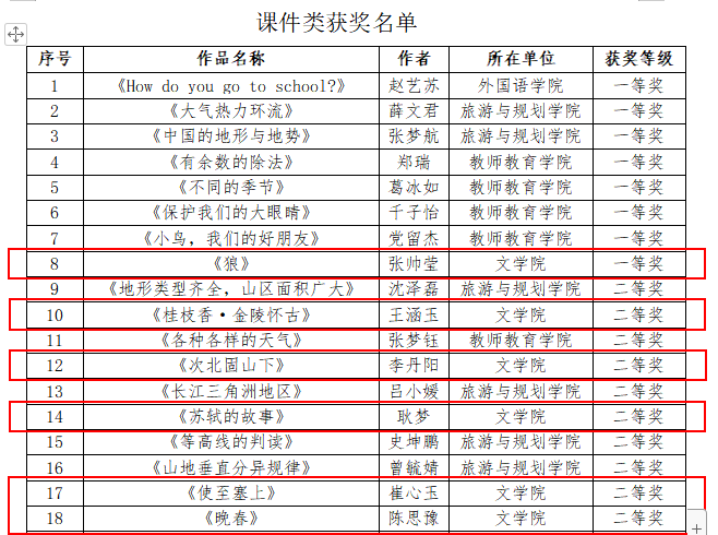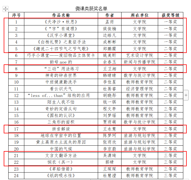近日,我校教务处公布了2022年度师范生信息化教学应用能力大赛结果,我院共39名学生获奖。其中,孟雨、侯俊楠、边皓凡、成彬彬获微课类一等奖,郑鹏霞、王卫湘获二等奖,王永慧、吴潇琦、郭晴获三等奖;张帅莹获课件类一等奖,王涵玉、李丹阳、耿梦、崔心玉等7人获二等奖,李笑、岳静怡、王宝樱、代敬琪等22人获三等奖。