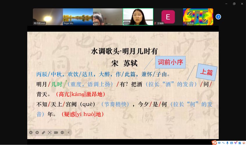 靡靡秋已夕,凄凄风露交。虽至暮秋,“我为海外华人上网课”公益课程项目2024年秋季班持续开展。北京时间2024年10月20日上午8:00,面向美国中文学习者开设的“华文鉴赏与诵读”第一课在线上拉开帷幕,我院青鸢国际中文教育团队成员蔡奕、杨育娴担任该课程的主讲老师和助教,与大洋彼岸的中文学习者一同赏读苏轼经典词作《水调歌头·明月几时有》。