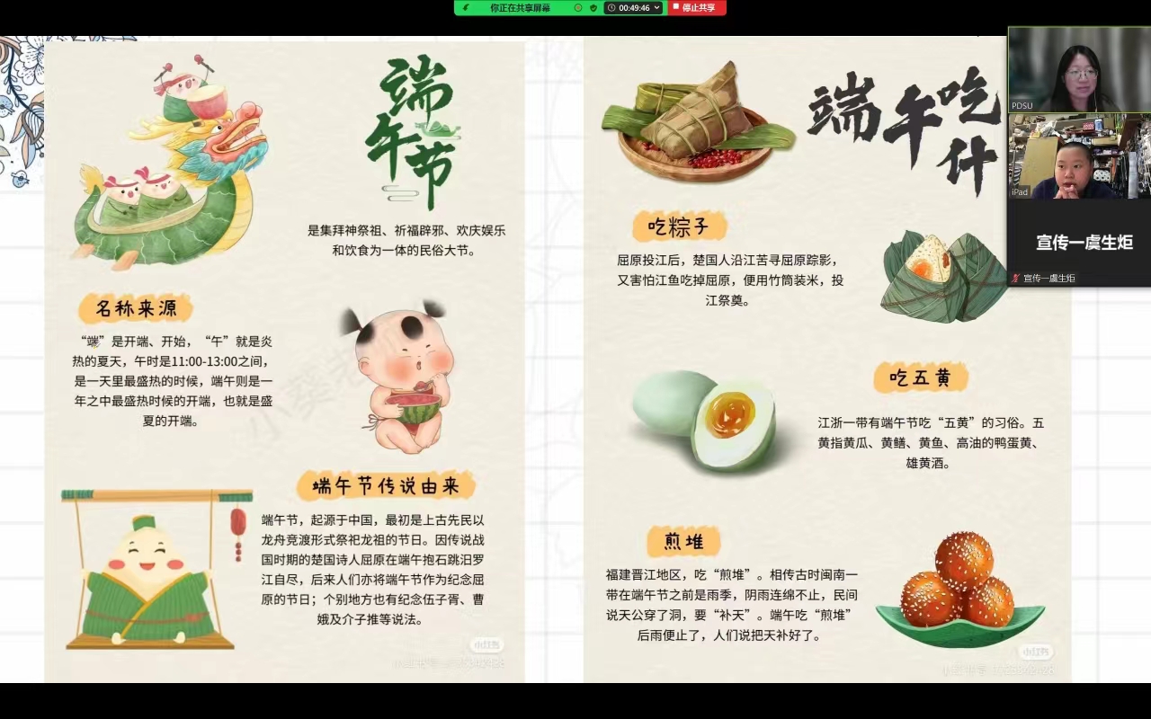 端午临中夏,时清日复长。日炽气蒸,“我为海外华人上网课”公益课程项目正在持续进行中。北京时间2024年6月8日,在面向南非的四年级中文课堂上,我院国际中文教育团队助教崔警元为中文学习者们带来了一堂以“端午节”为主题的线上课。