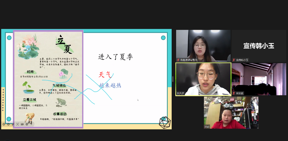 夏早日初长,南风草木香。初夏已至,“我为海外华人上网课”公益课程项目持续进行中。北京时间2024年5月11日,在四年级的南非中文课堂上,我院国际中文教育团队主讲教师刘凡语与助教崔警元为中文学习者们分享了有关立夏节气的小知识。