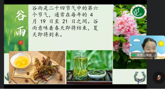 谷雨春光晓,山川黛色新。北京时间2024年4月21日,“我为海外华人上网课”公益课程项目伴随谷雨节气持续进行。我院国际中文教育团队主讲教师为印度尼西亚和南非等国的中文学习者授课,讲解中华谷雨节气的传统知识。
