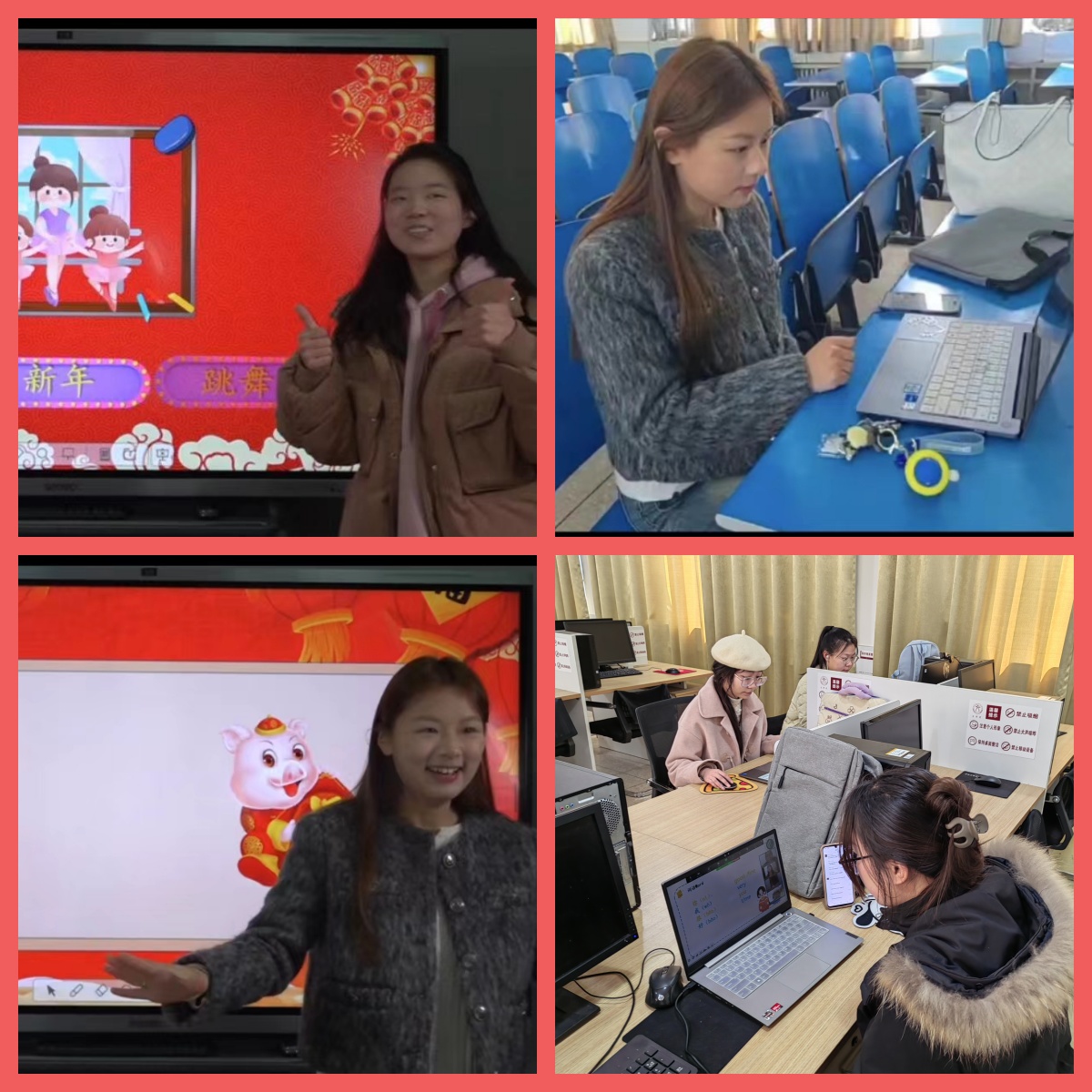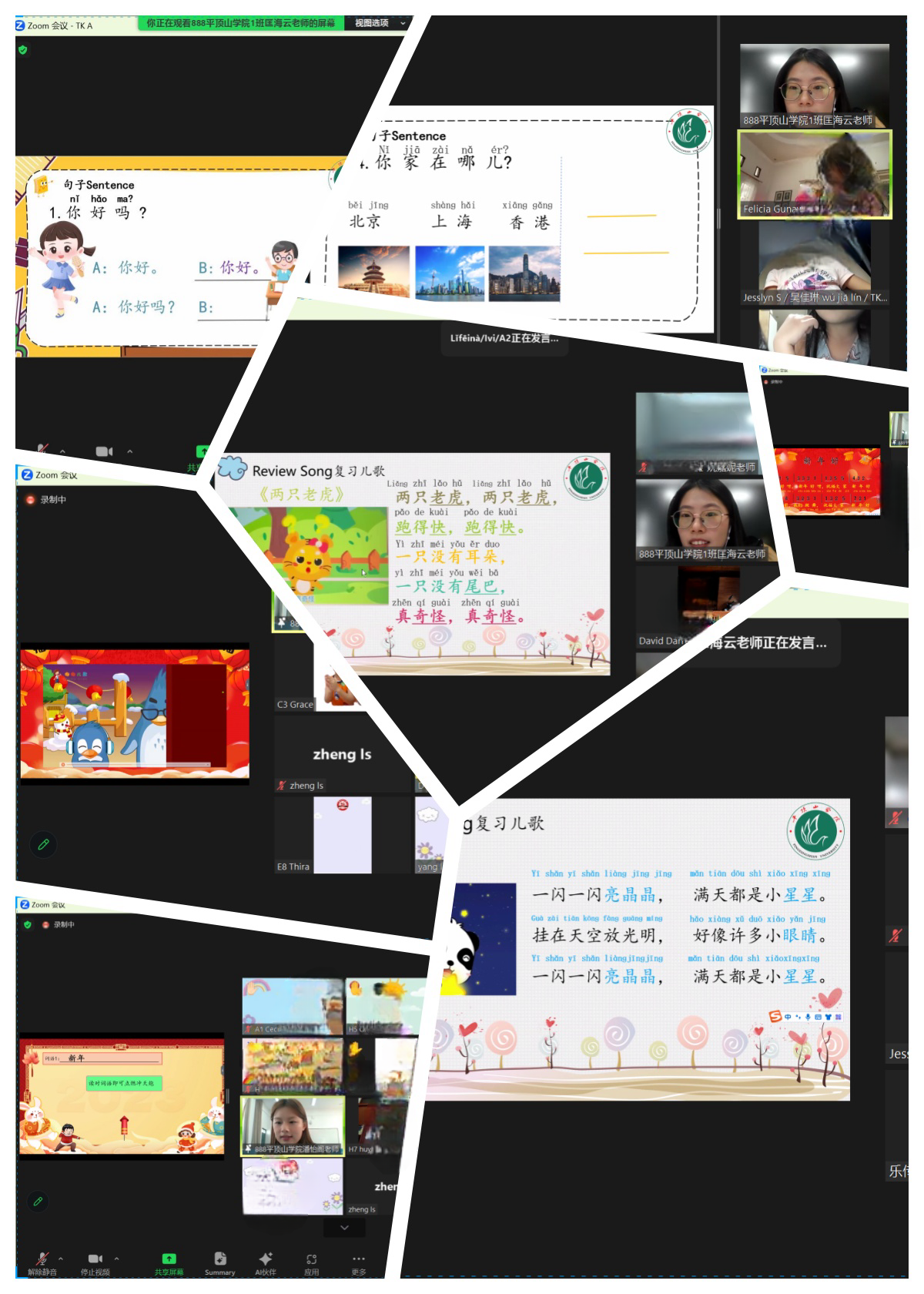 本次春季班首次面向印尼5-7岁的华裔学龄前儿童开设。学龄前儿童正处于第二外语习得的关键期,语言模仿能力和效果最佳,适合我们开展华文教育。担任此次授课任务的文学院2022、2023级学生通过网络,第一次站在虚拟的讲台上。为了将最佳状态展示给海外学员,他们经历了长期的学习和训练,在老师的现场指导下多次磨课。当天的课程在四个教室同时开展,授课教师为印尼小朋友认真示范了“你好吗”“欢迎”“你会唱儿歌吗”“你的家在哪儿”等简单的中文问候语、问句,并让小朋友们做游戏,互相问候,模仿学习;老师们还教唱《两只老虎》《小星星》《新年好》等脍炙人口的中文儿歌,带领大家一句句学唱,注意音节、节奏、发音、口型,课堂气氛非常活跃。