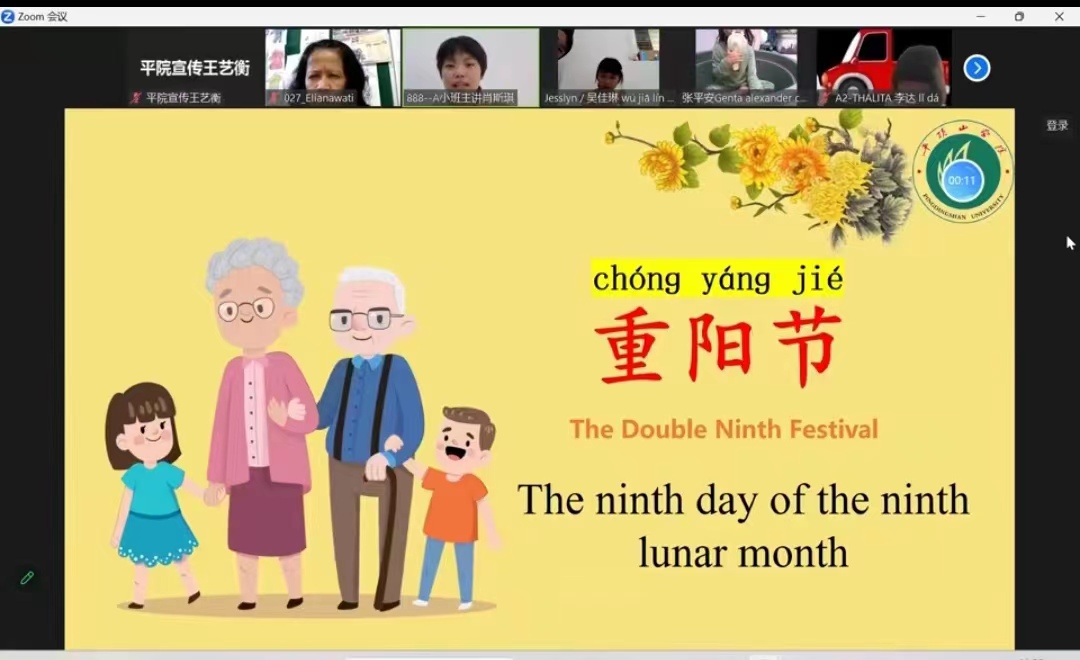 一年一度重阳至,尊老敬老赏菊花。北京时间2023年10月16日至22日,2023年秋季线上“我为海外华人上网课”志愿服务项目持续开展,我院派出了20多位经验丰富的主讲教师,为来自美国、英国、印度尼西亚、南非等国的华人华裔学员授课。