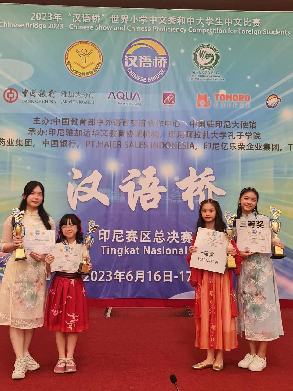 北京时间2023年6月17日,由教育部中外语言交流合作中心、中国驻印度尼西亚大使馆主办,印尼雅加达华文教育协调机构(以下简称“雅协”)和阿拉扎大学孔子学院联合承办的第二十二届“汉语桥”世界大学生中文比赛、第十六届“汉语桥”世界中学生比赛和第三届“汉语桥”世界小学生中文秀印尼赛区总决赛在印度尼西亚首都雅加达举行。由我院国际中文教育团队老师辅导的印尼学生黄子嘉获得小学组一等奖,伍劲晓获得小学组二等奖,陈嘉懿获得中学组三等奖,黄筱媃获得中学组优秀奖。